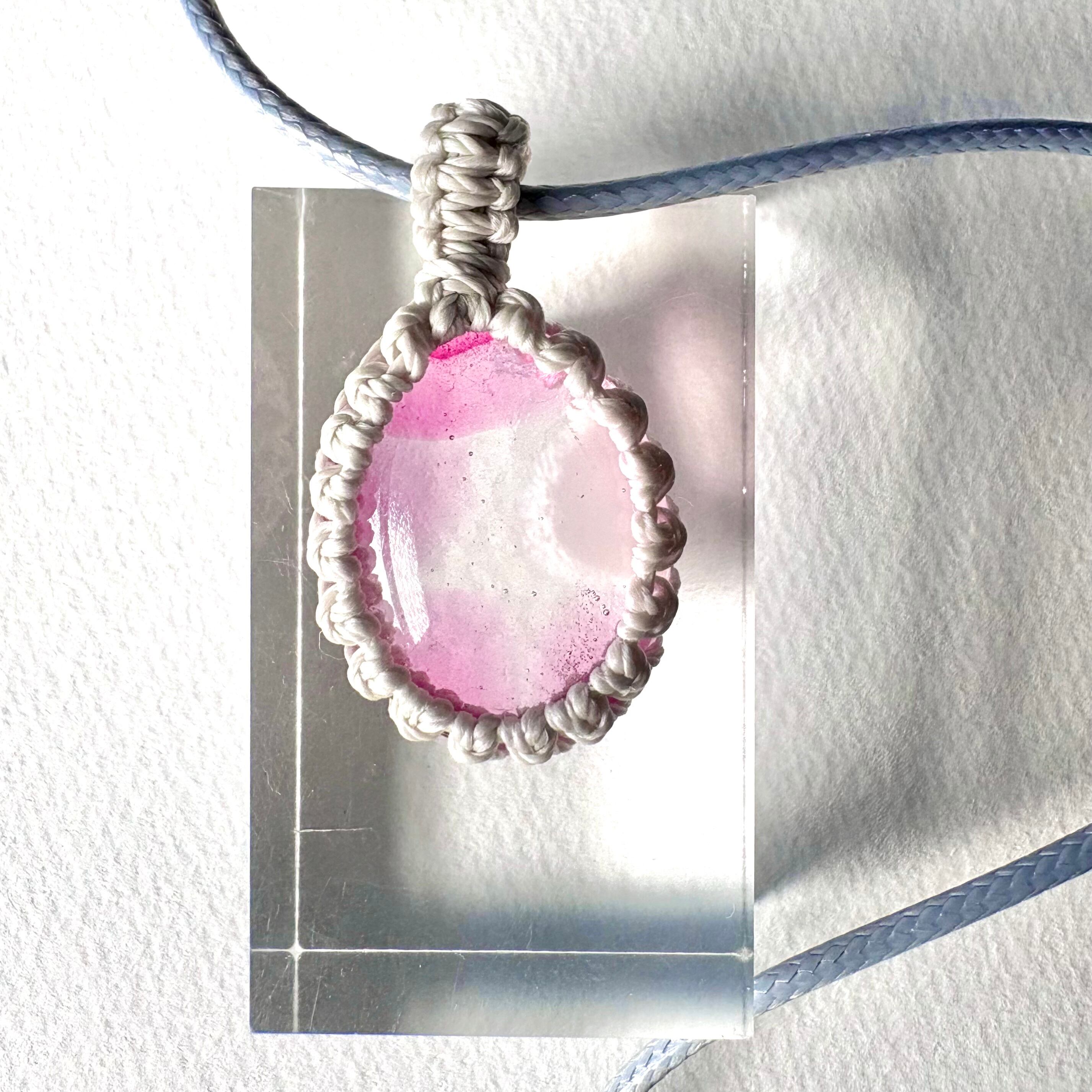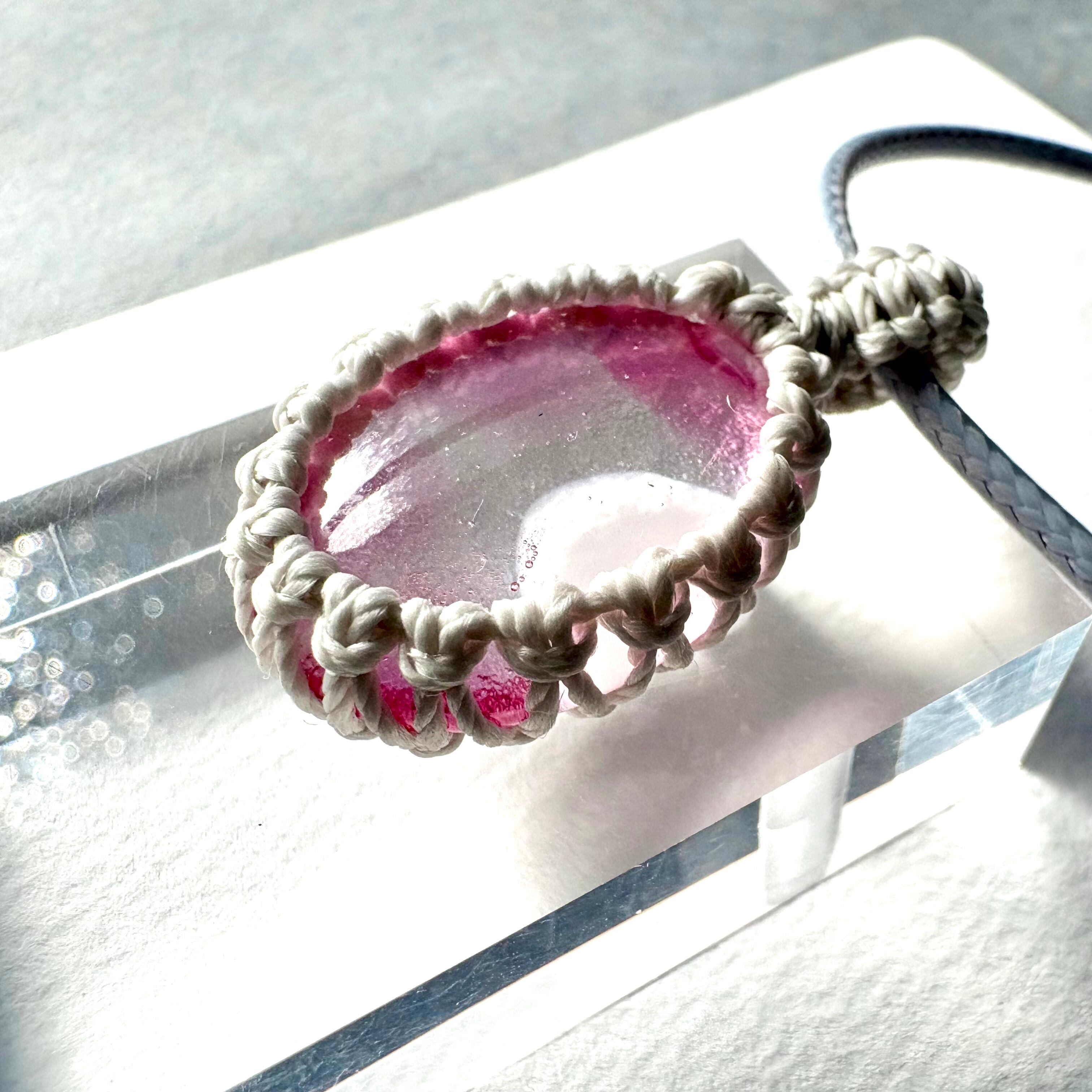 琉球ガラスの個性的な粒をマクラメ編みで包んでペンダントにしました。