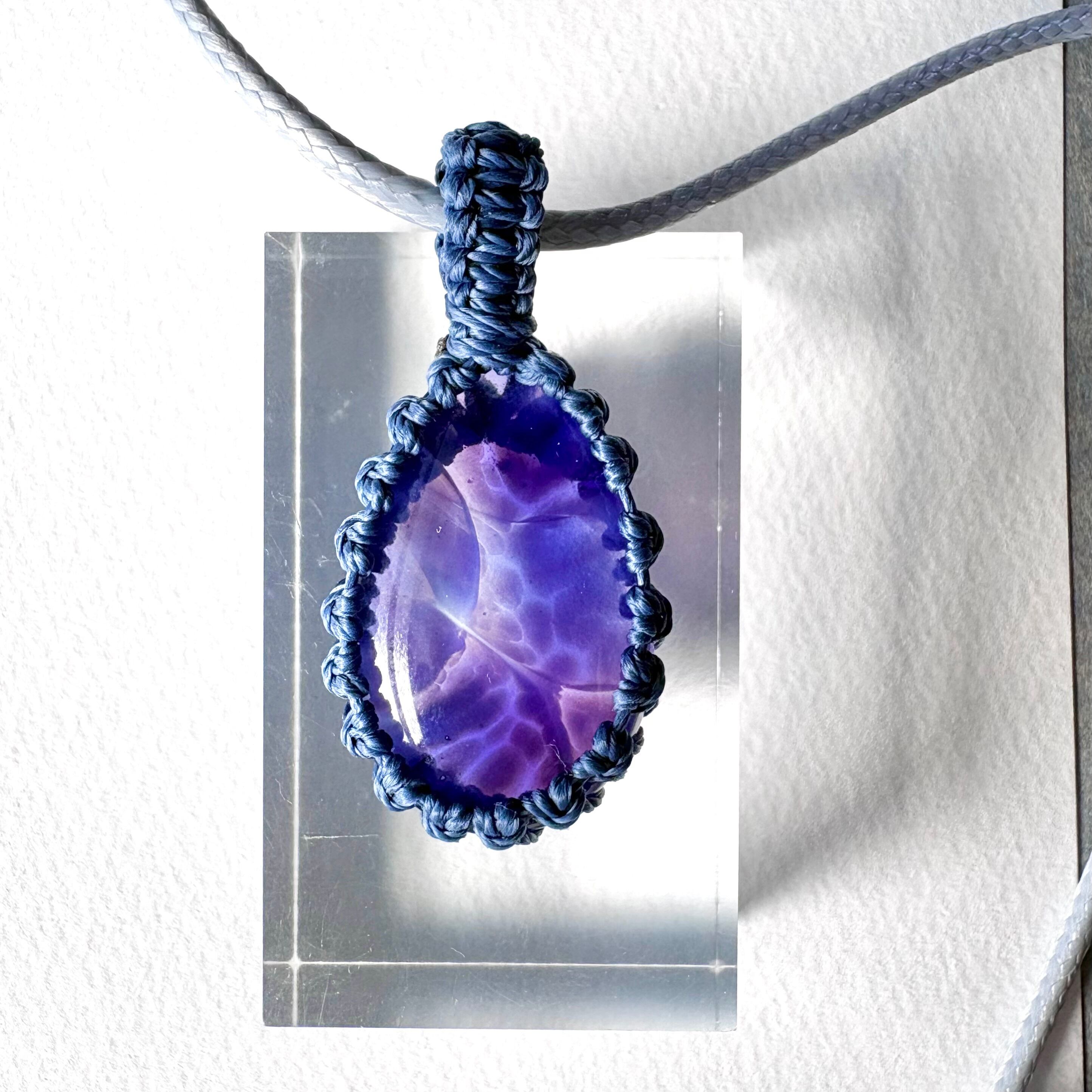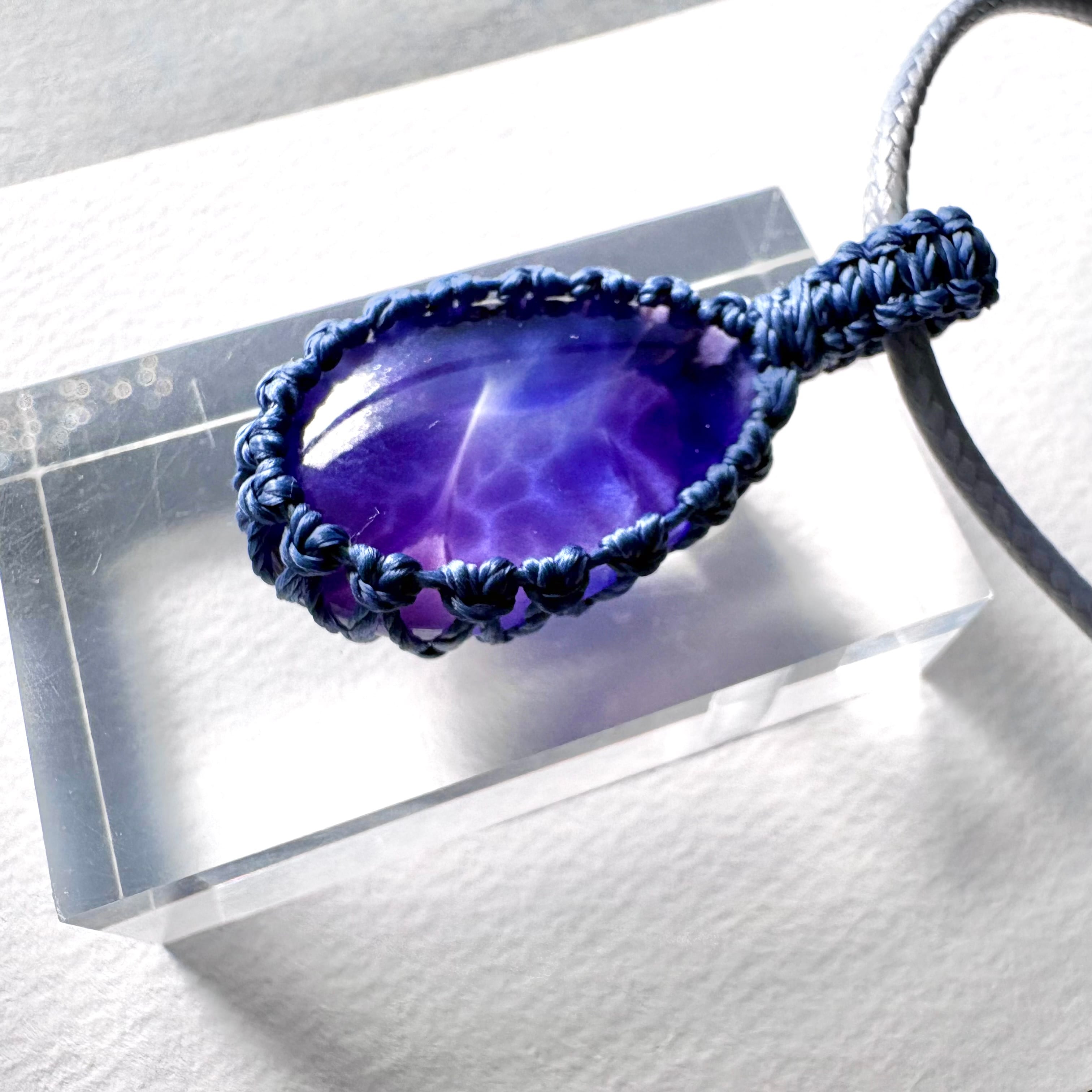 琉球ガラスの個性的な粒をマクラメ編みで包んでペンダントにしました。