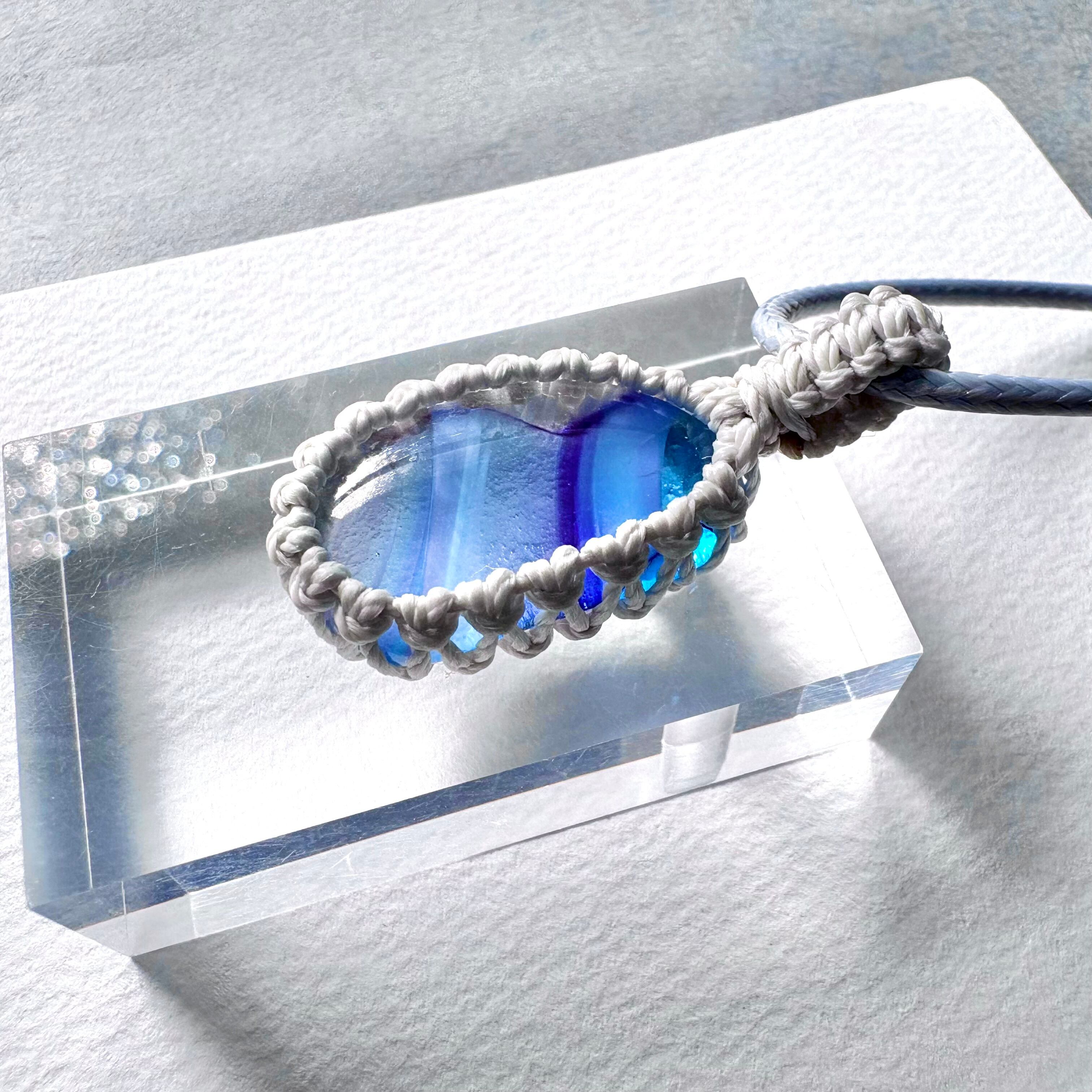 琉球ガラスの個性的な粒をマクラメ編みで包んでペンダントにしました。