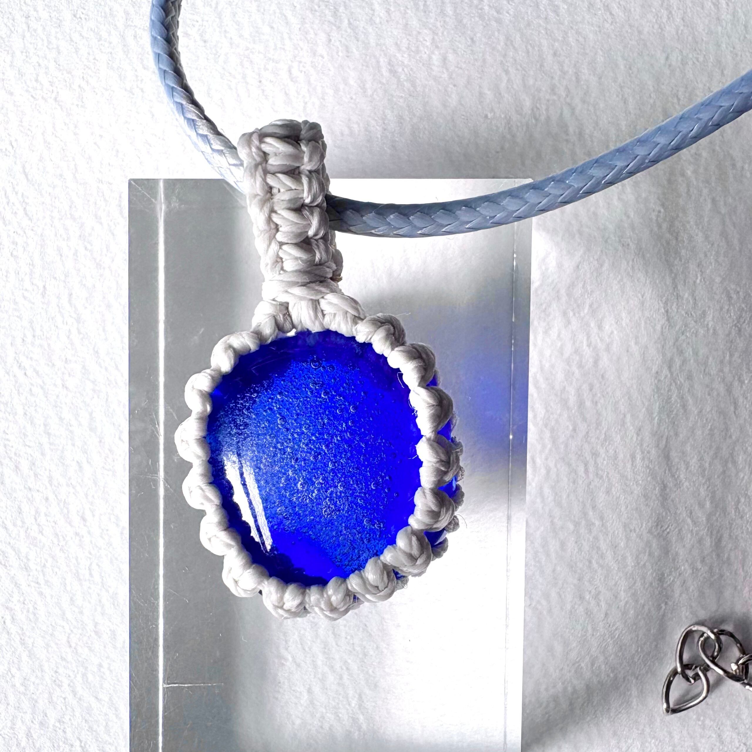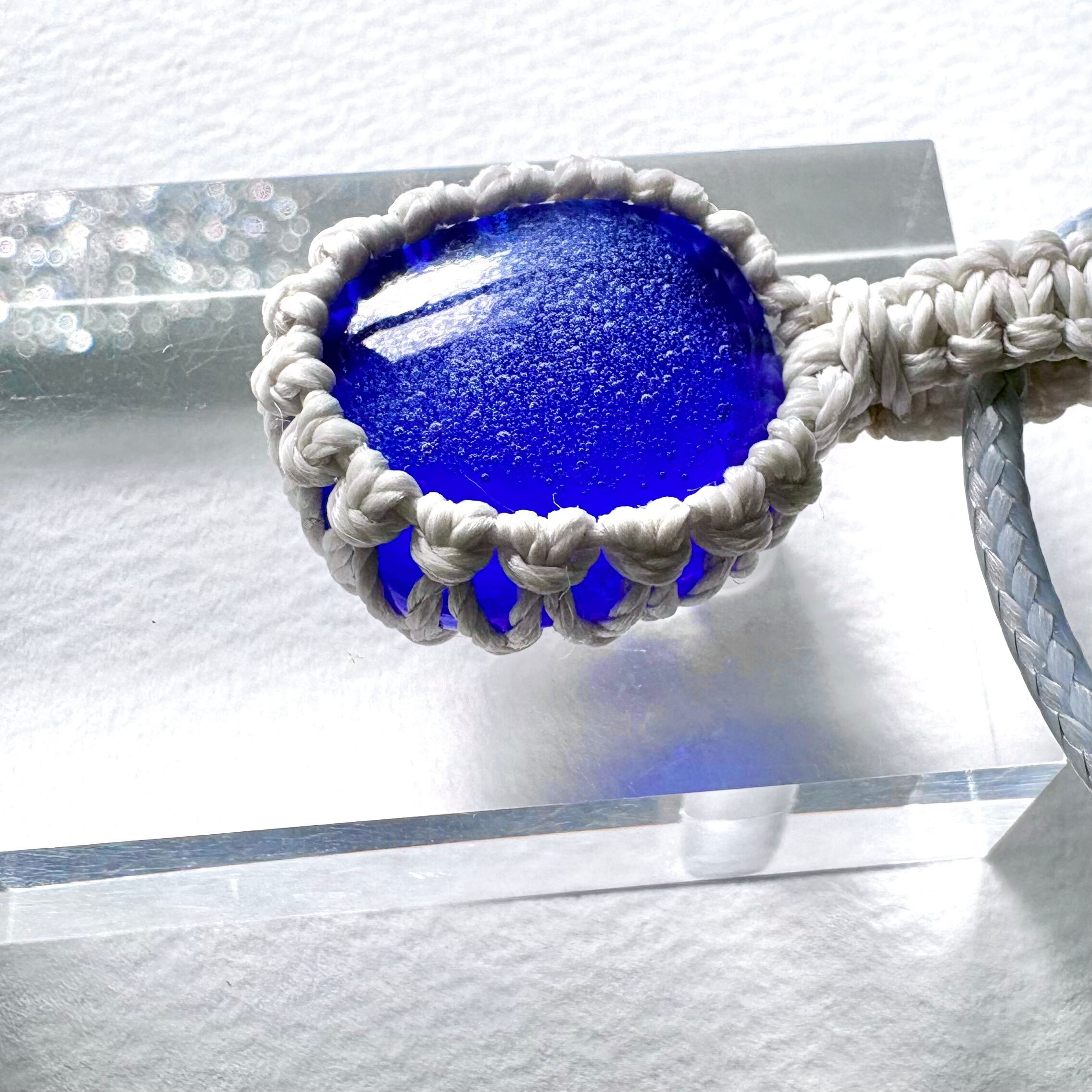 琉球ガラスの個性的な粒をマクラメ編みで包んでペンダントにしました。