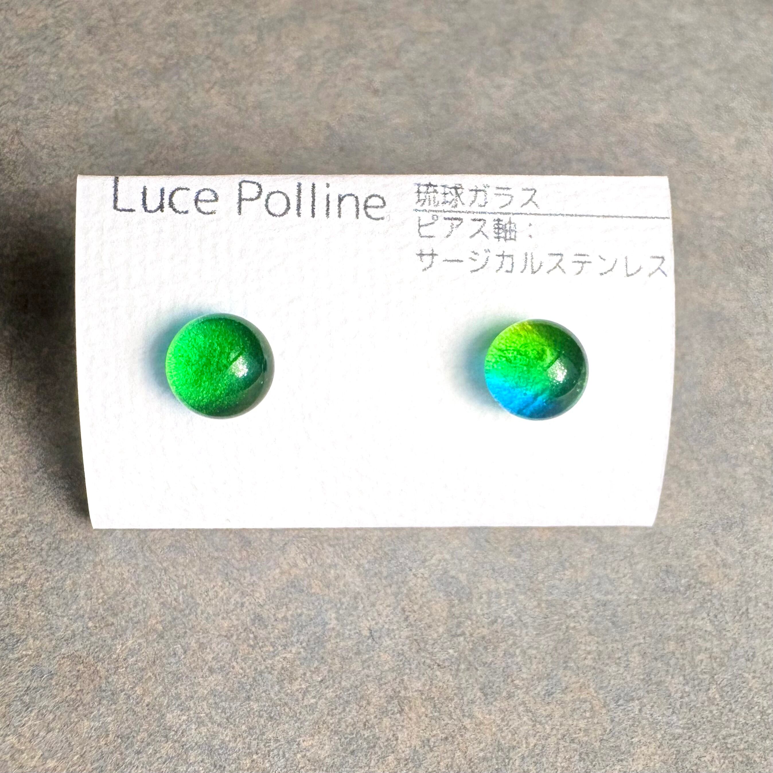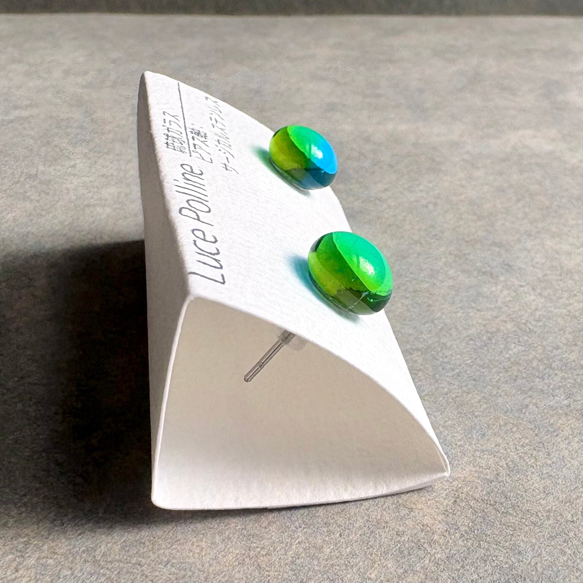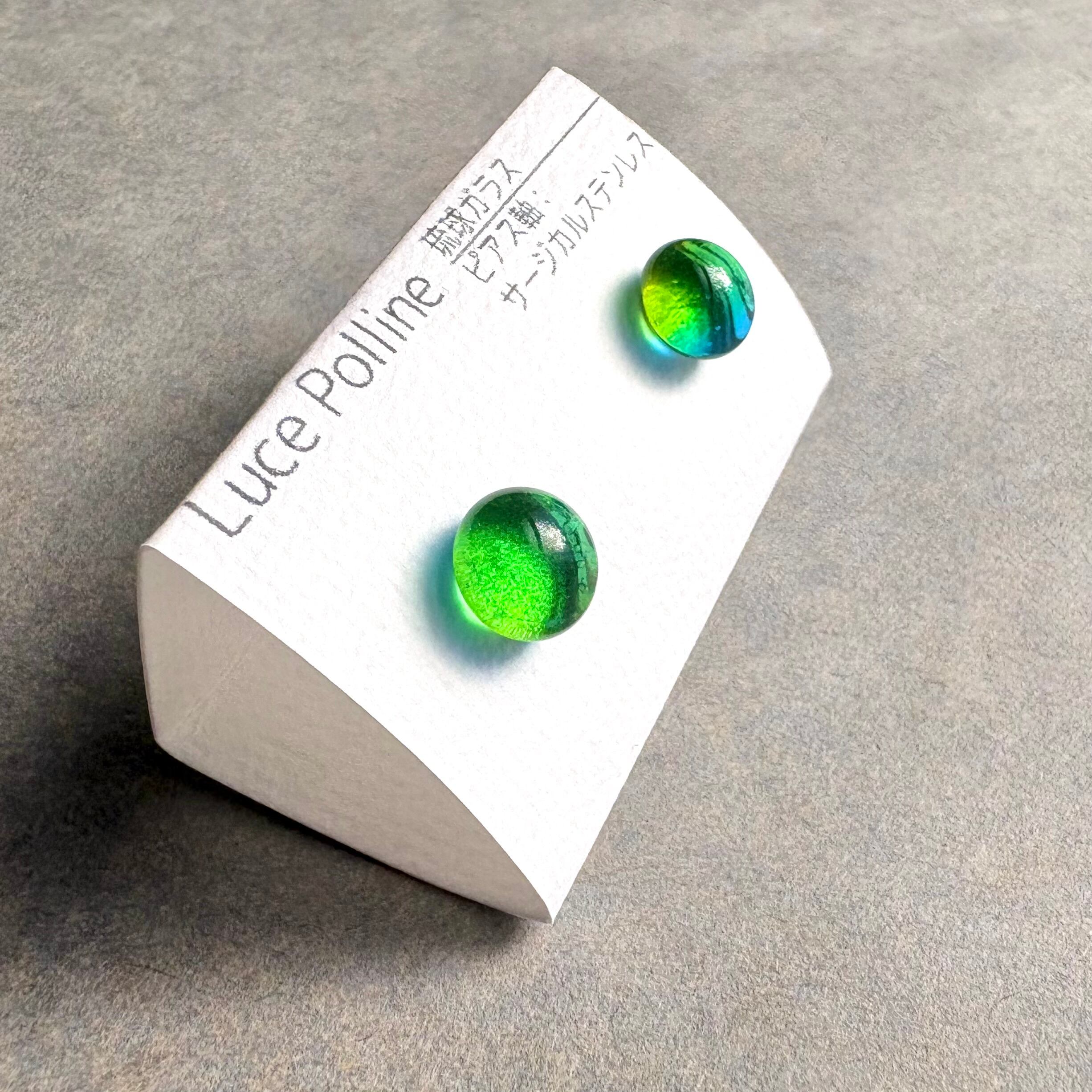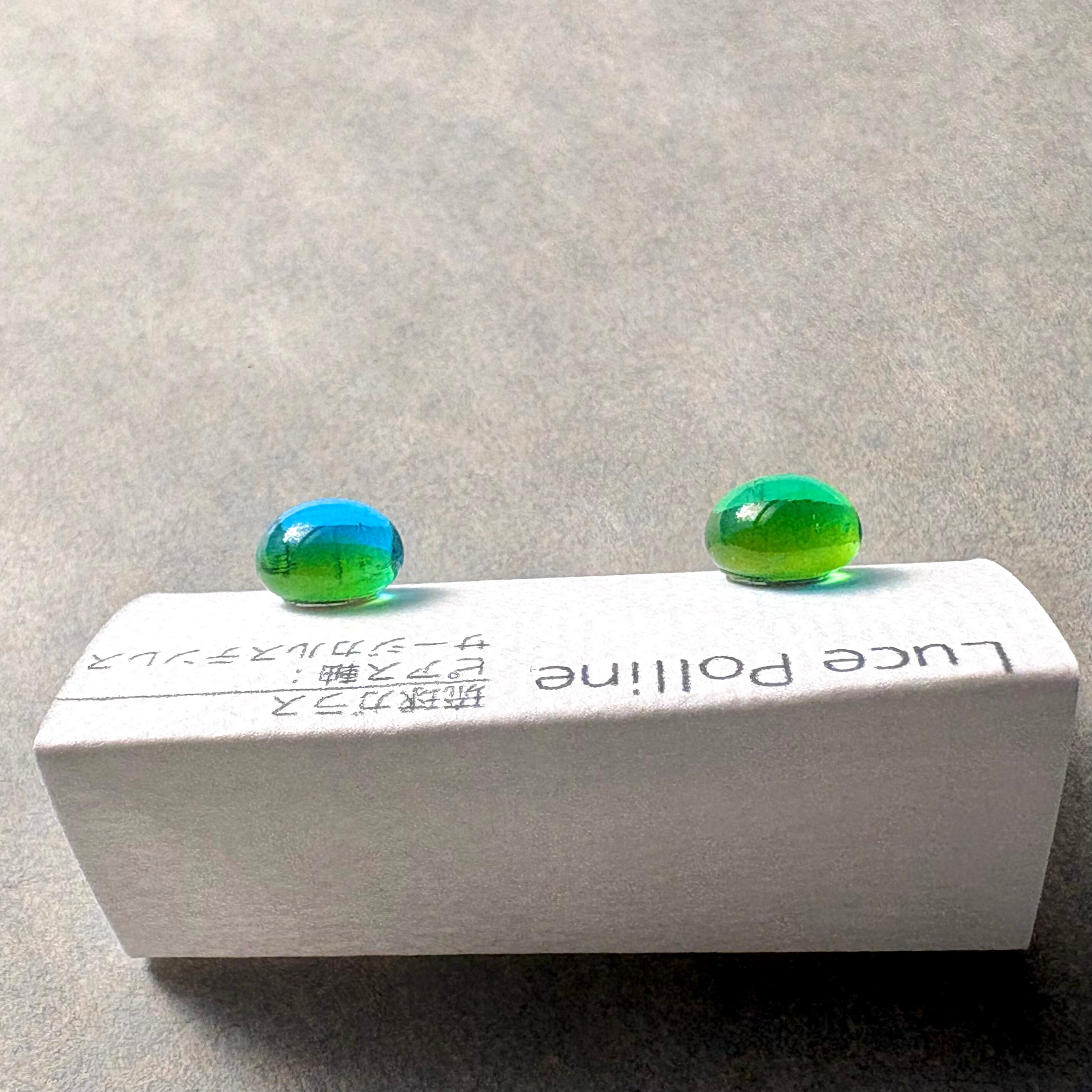 透明な青と透明な緑のガラスが溶け合う粒です。