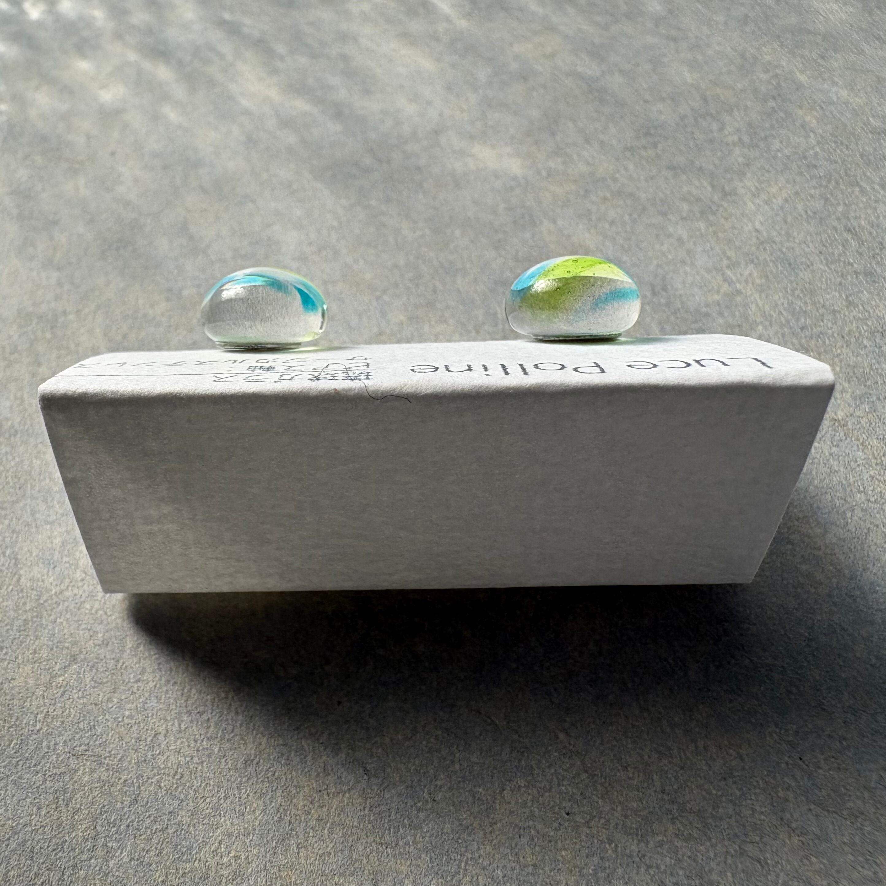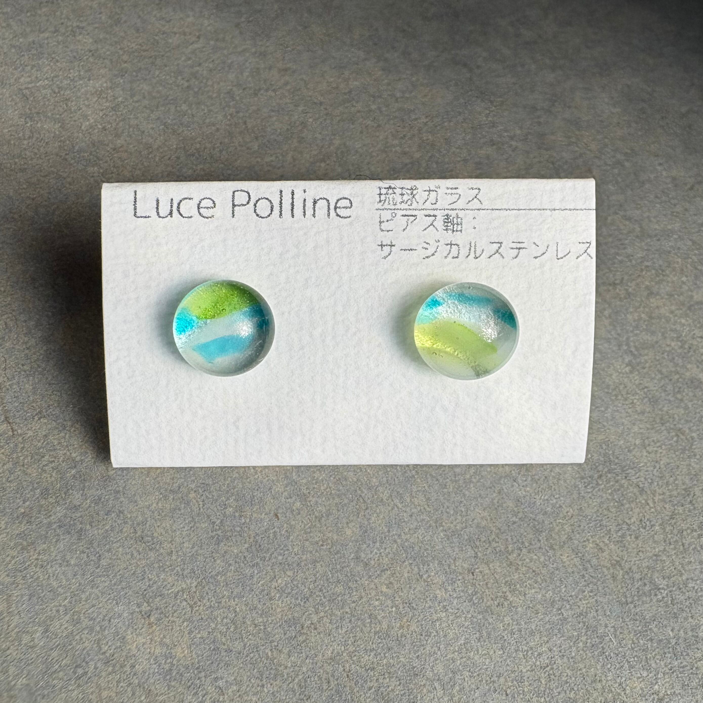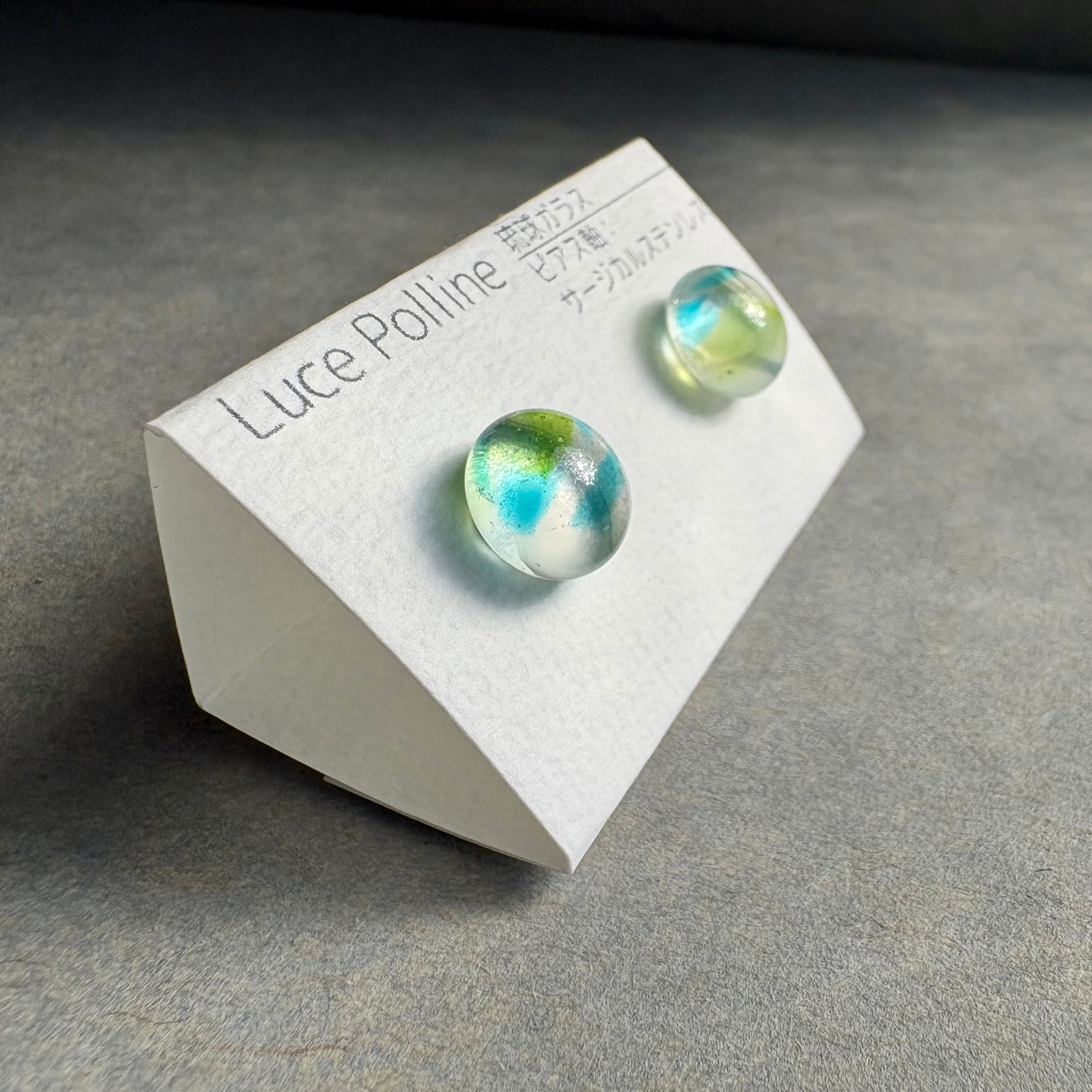 奥に流れる白いガラス、表面に走る青や緑が、波の上を撫でて流れる風のようなイメージの琉球ガラスのピアスです。