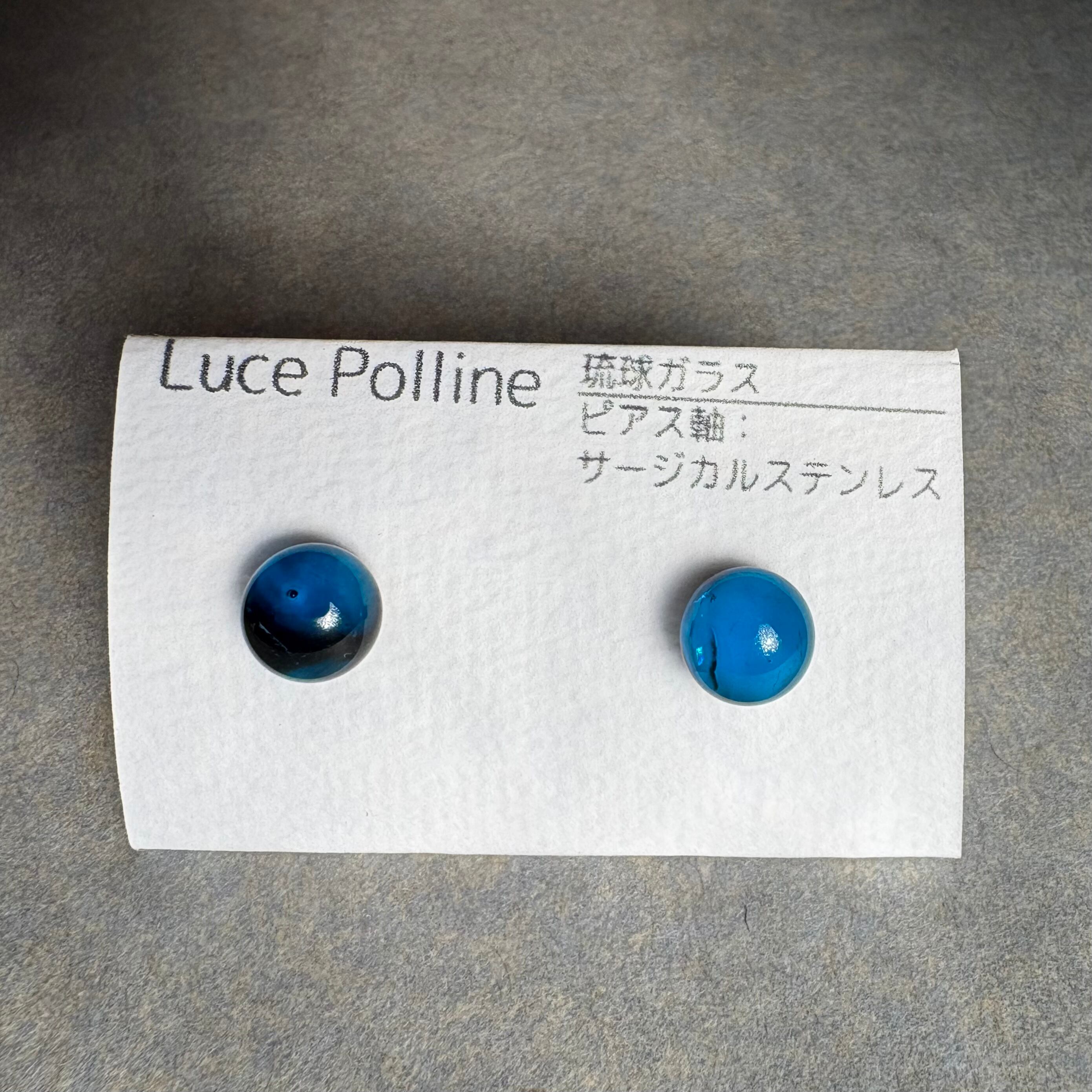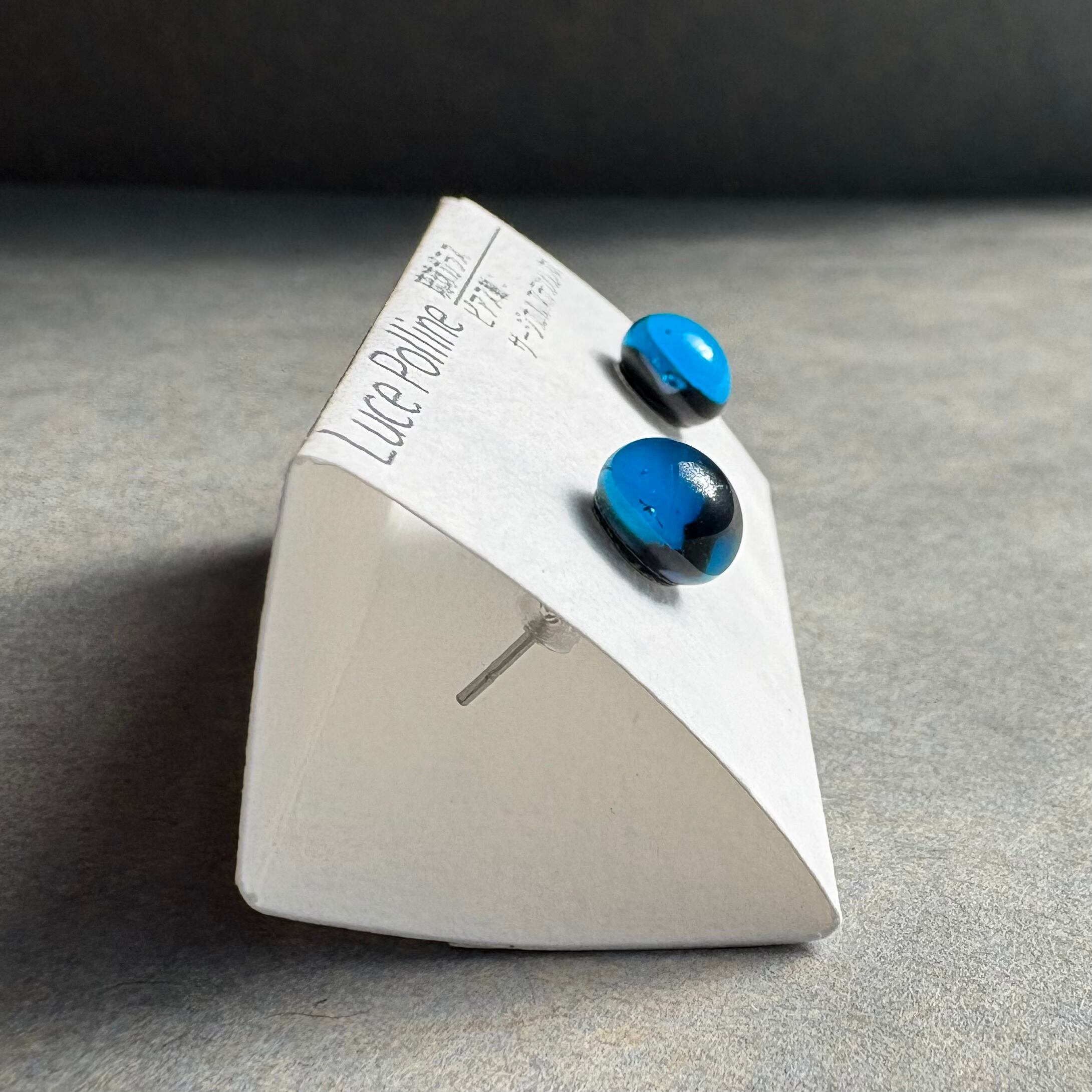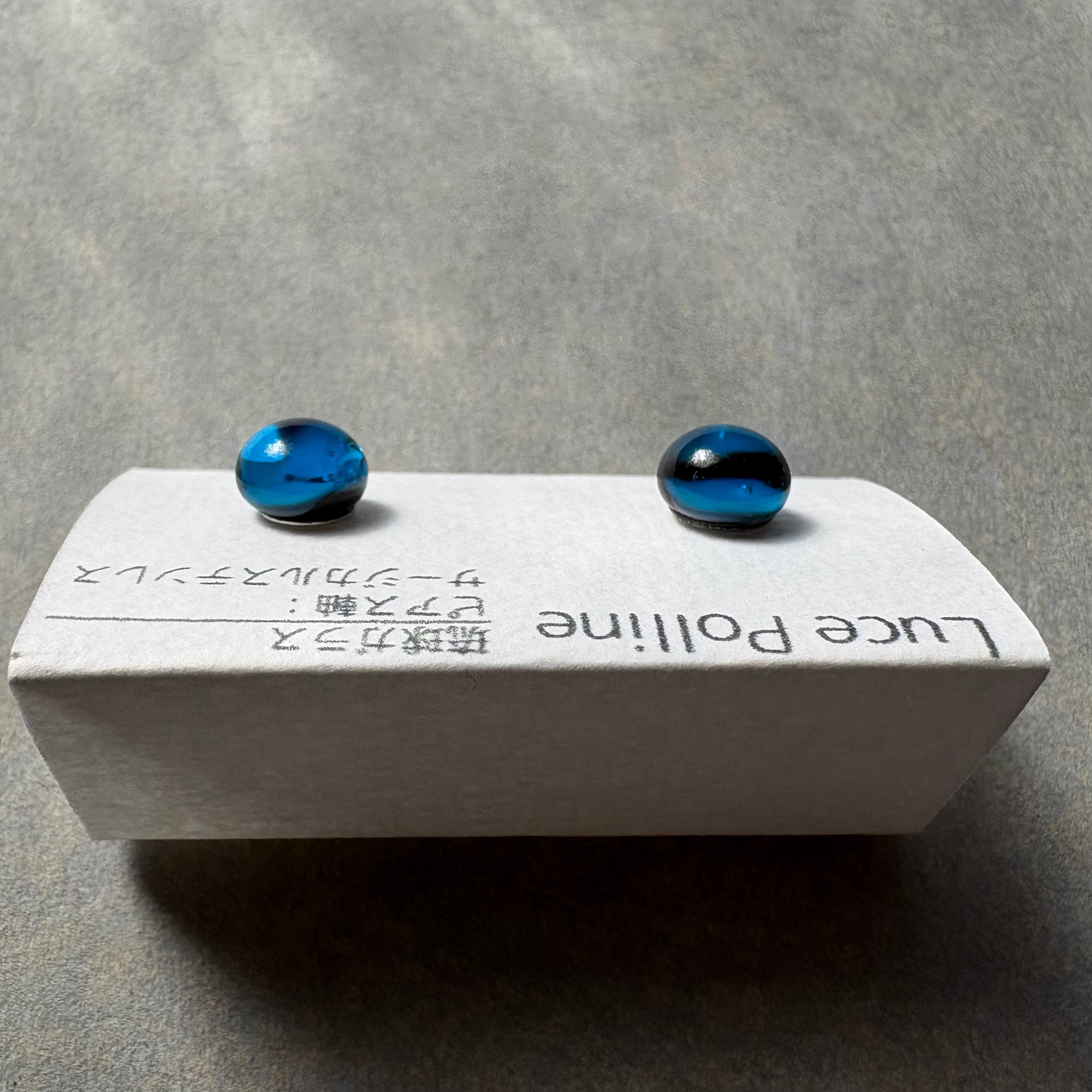 透ける青の奥に、影のような黒が覗く琉球ガラスのスタッドピアスです。