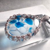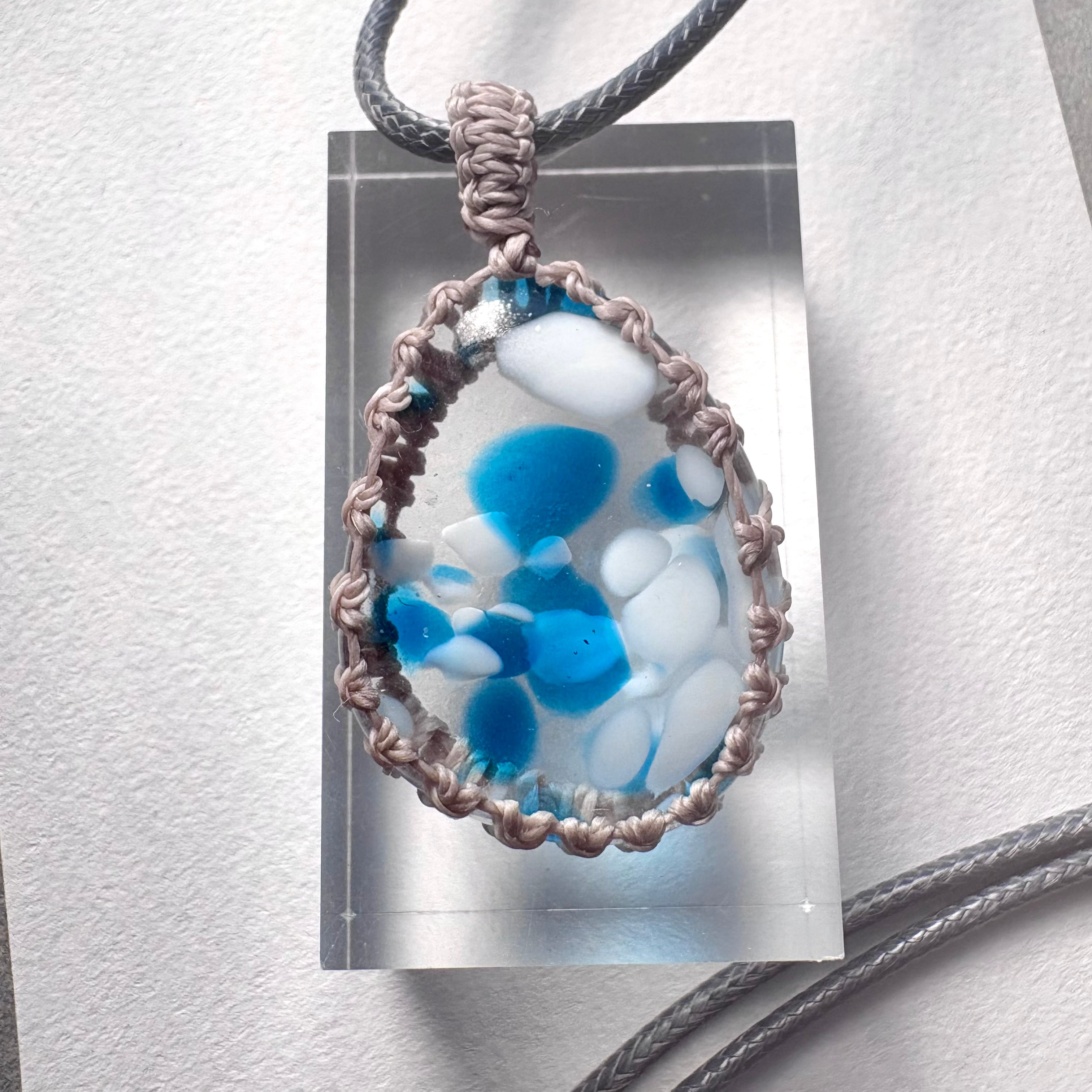 琉球ガラスの個性的な粒をマクラメ編みで包んでペンダントにしました。