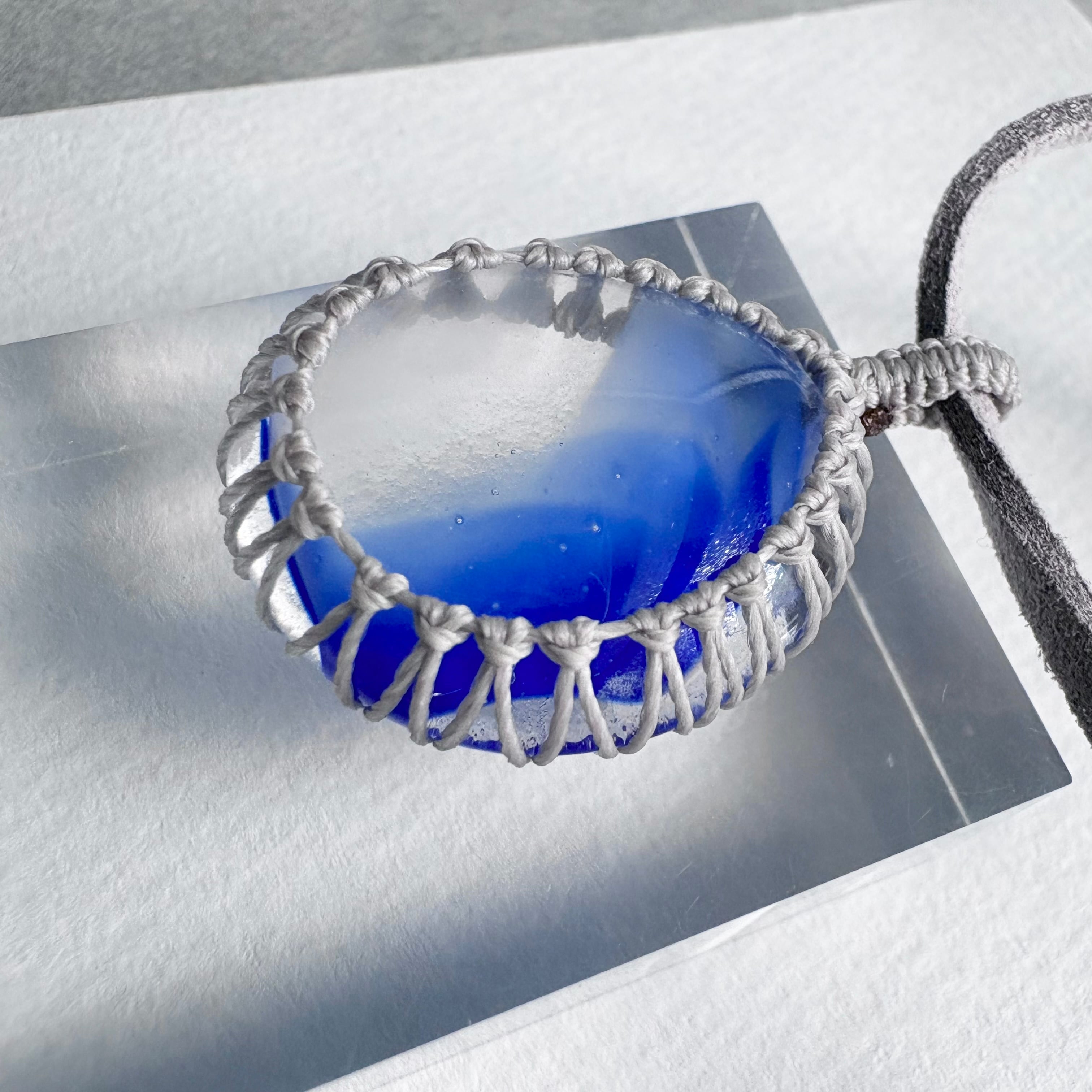 琉球ガラスの個性的な粒をマクラメ編みで包んでペンダントにしました。