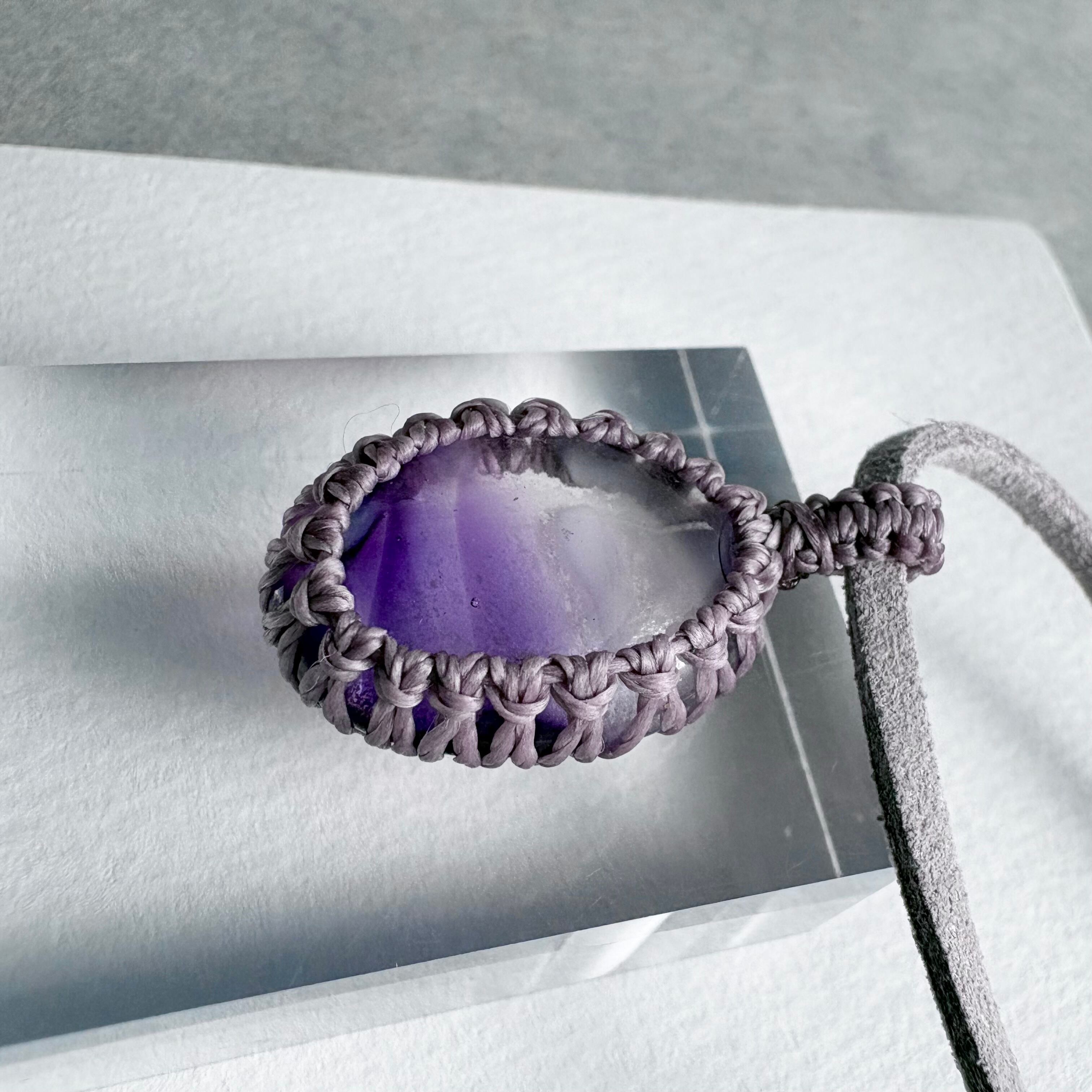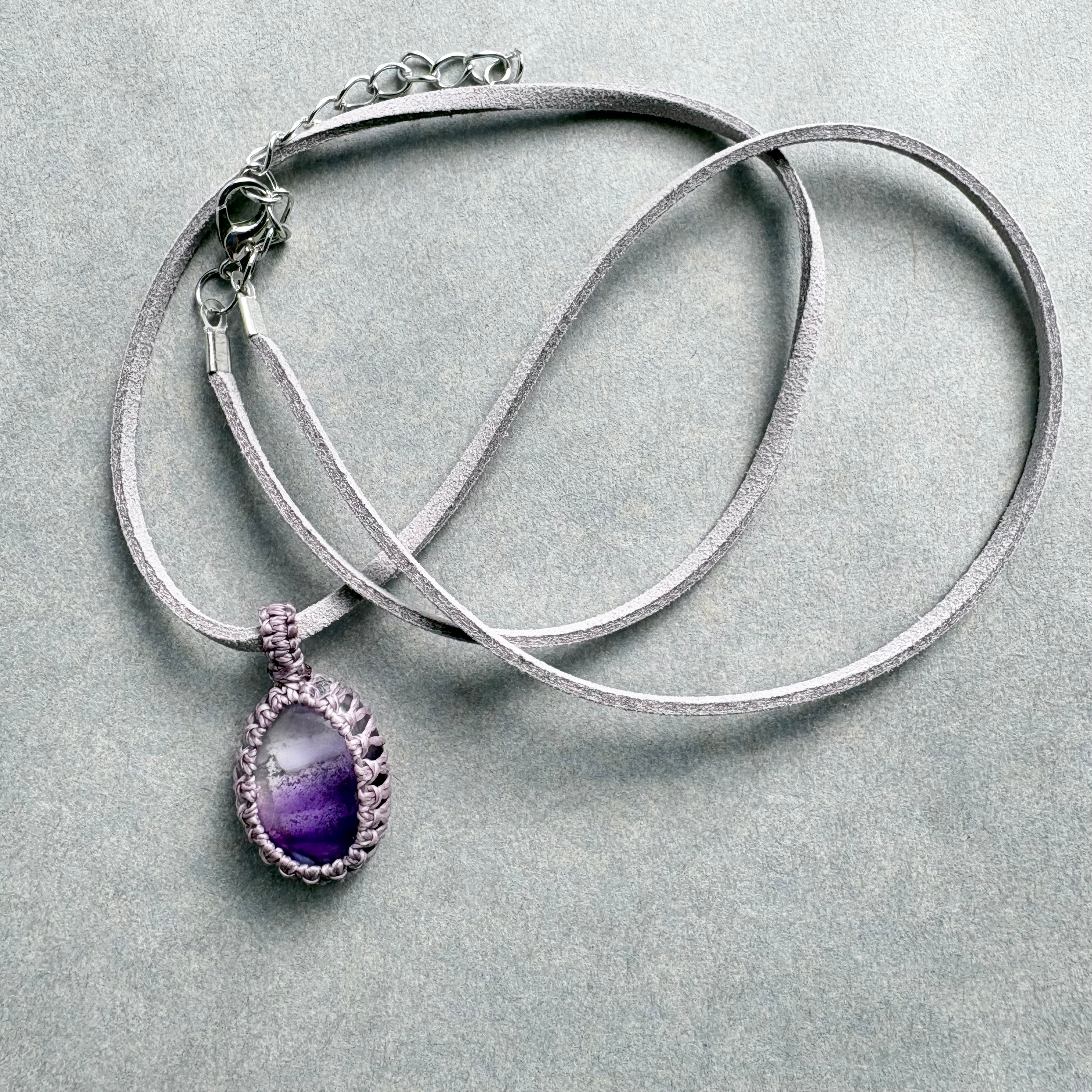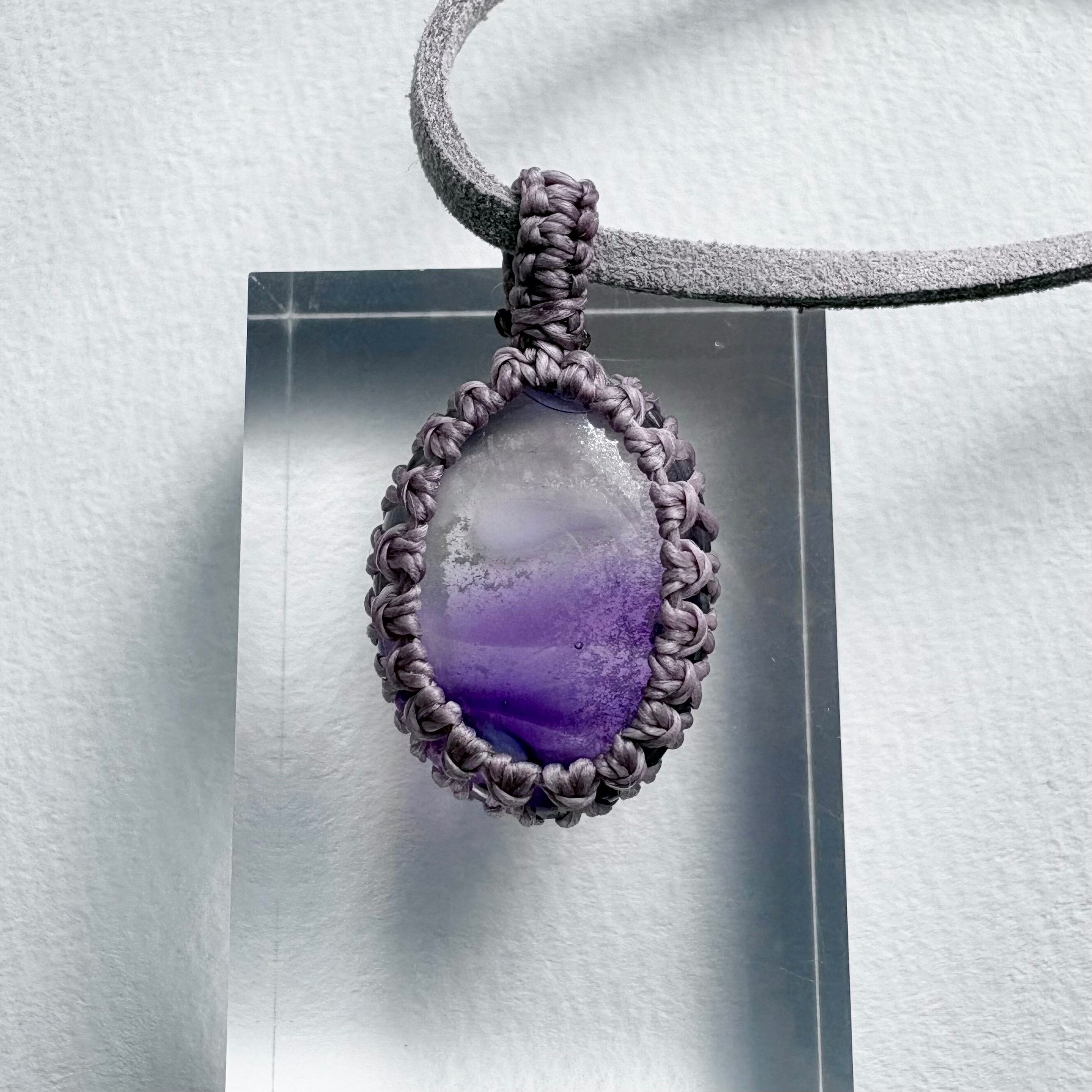 琉球ガラスの個性的な粒をマクラメ編みで包んでペンダントにしました。