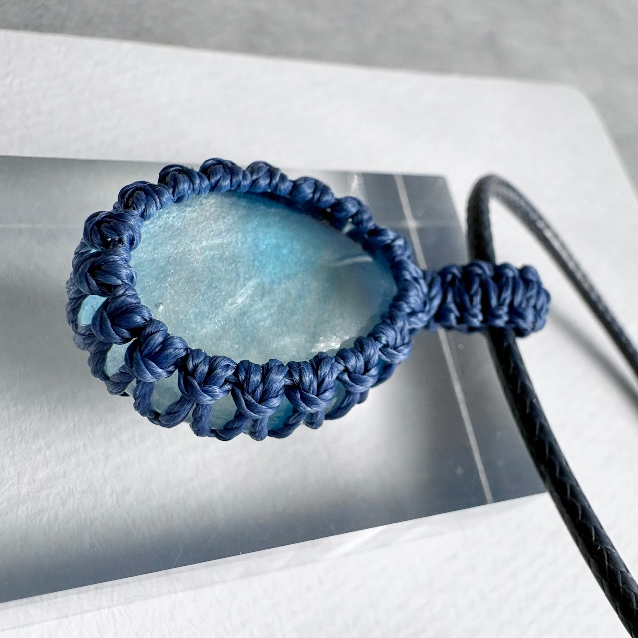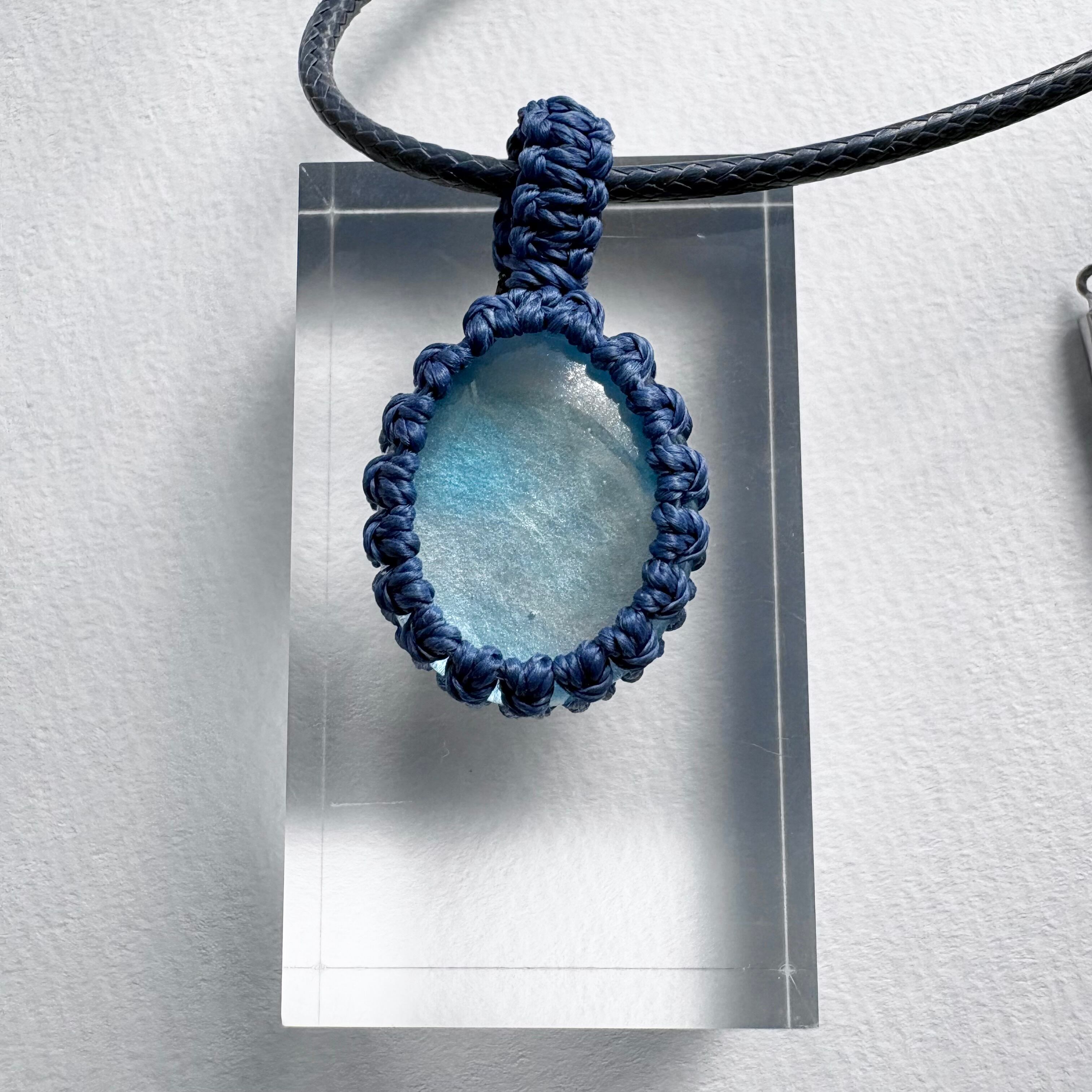 琉球ガラスの個性的な粒をマクラメ編みで包んでペンダントにしました。