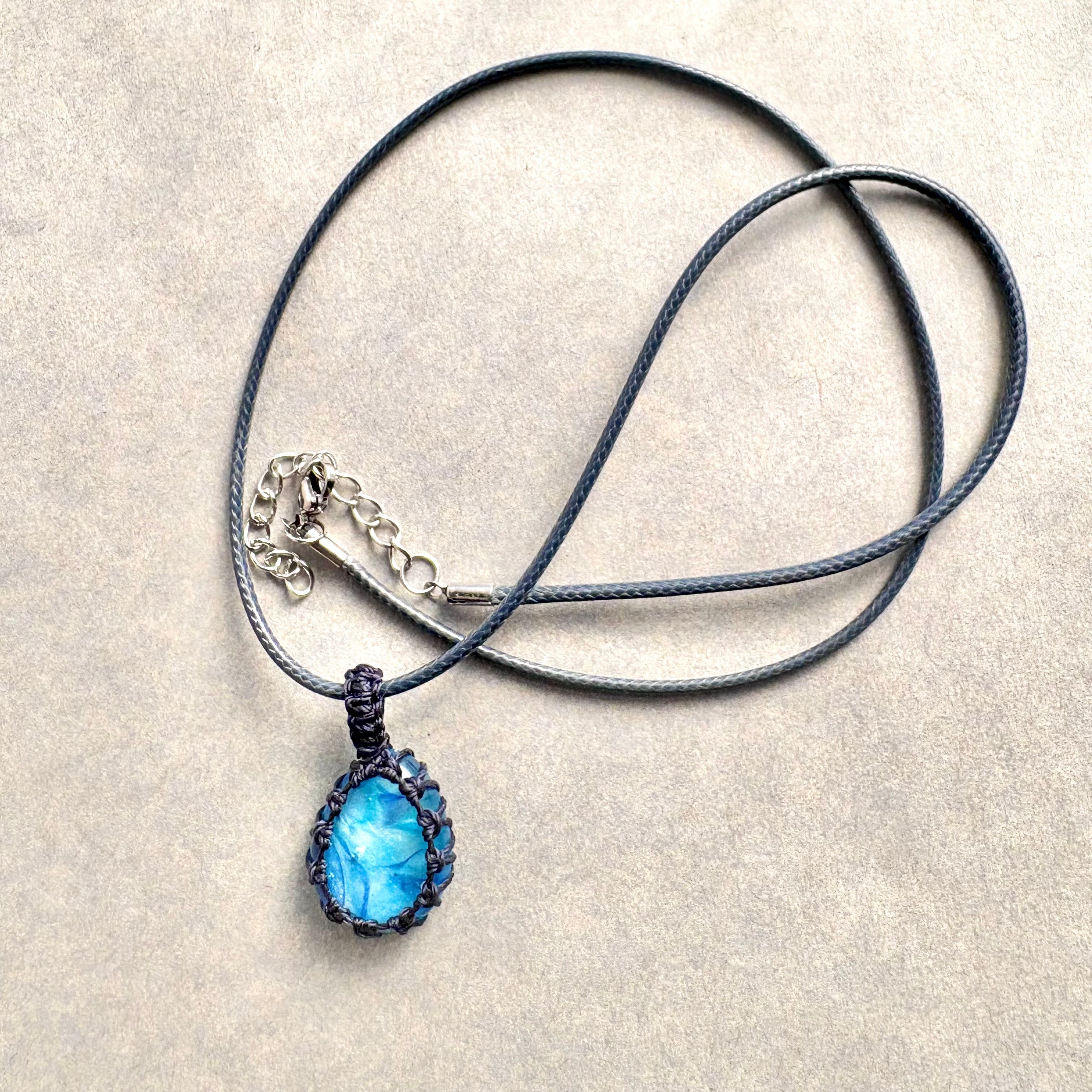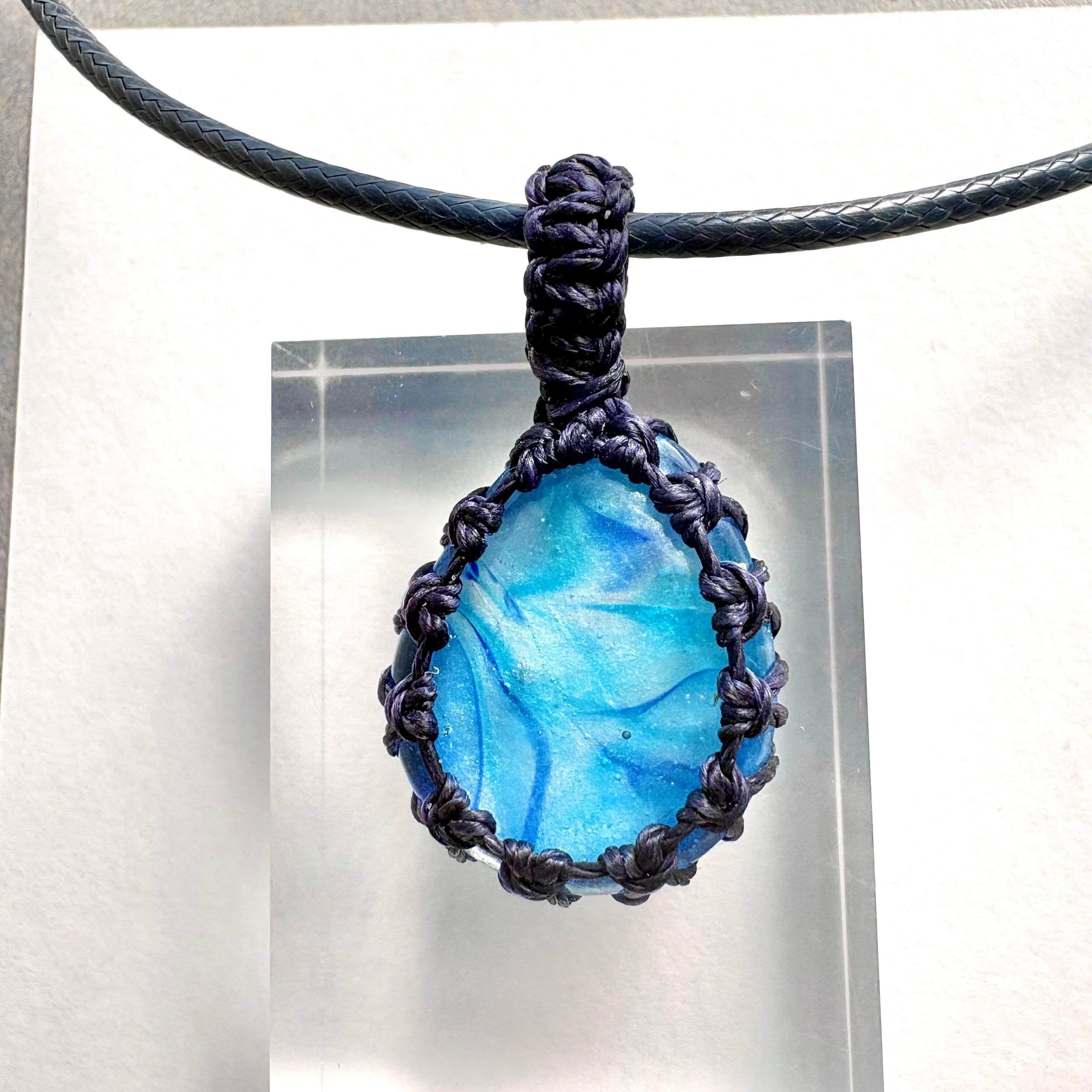 琉球ガラスの個性的な粒をマクラメ編みで包んでペンダントにしました。