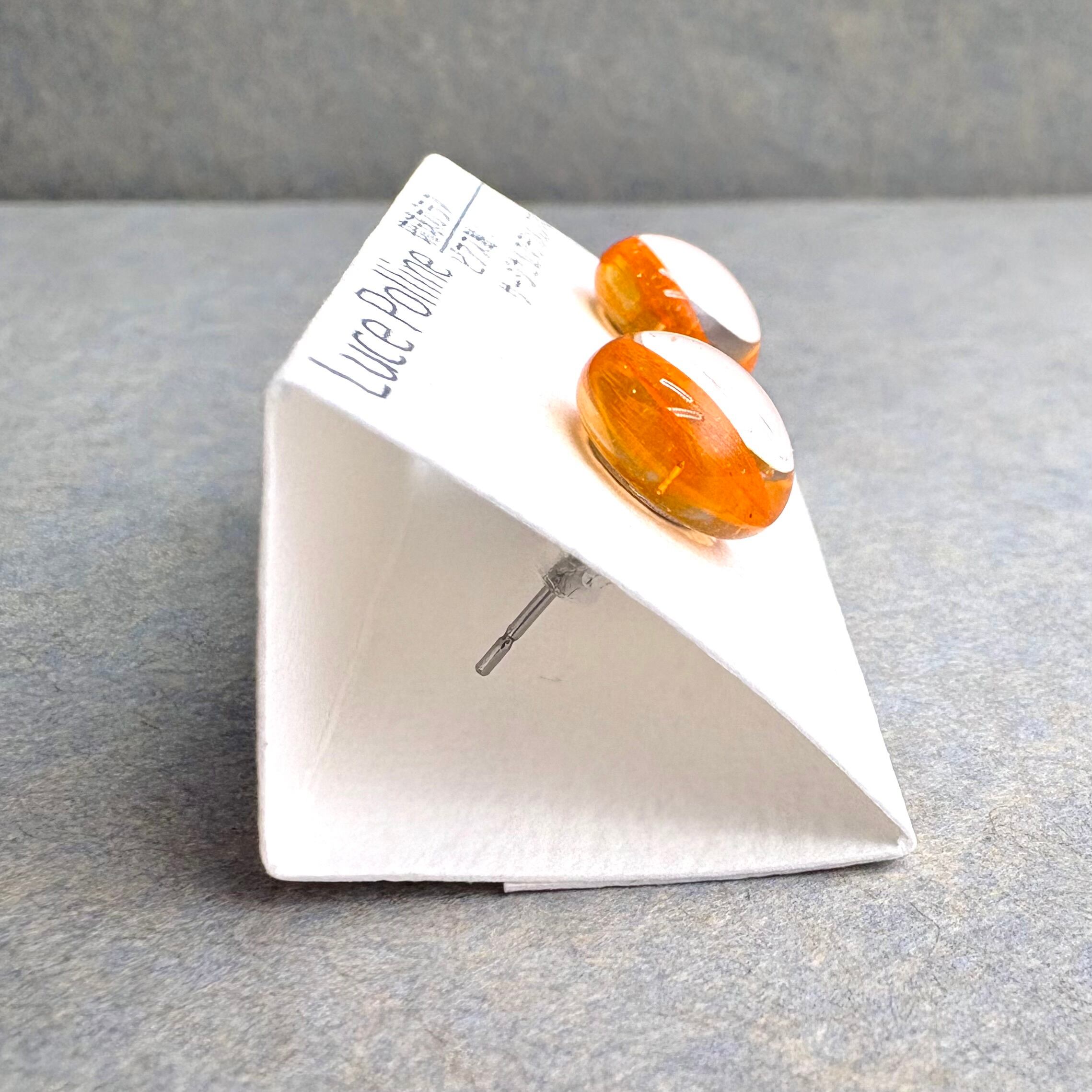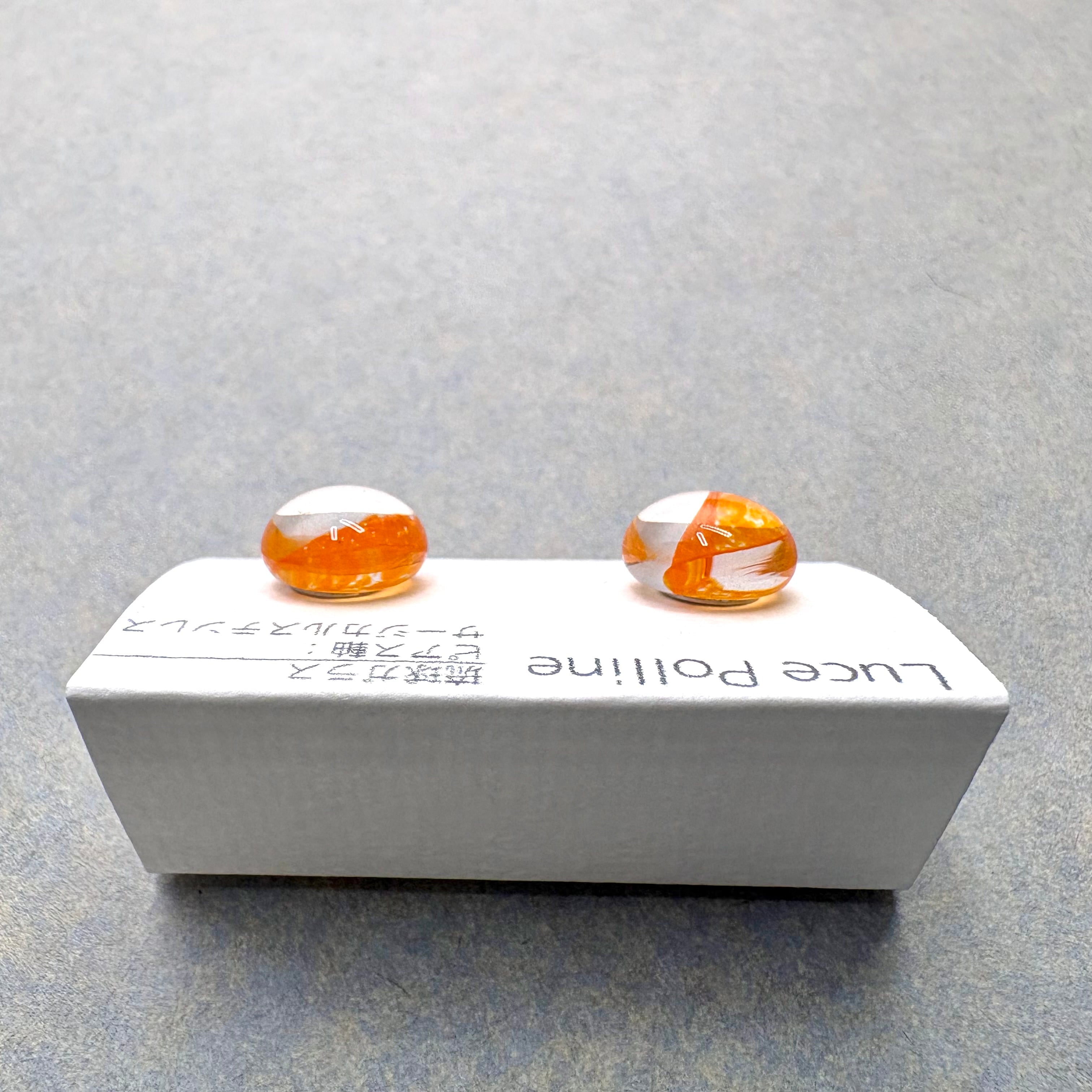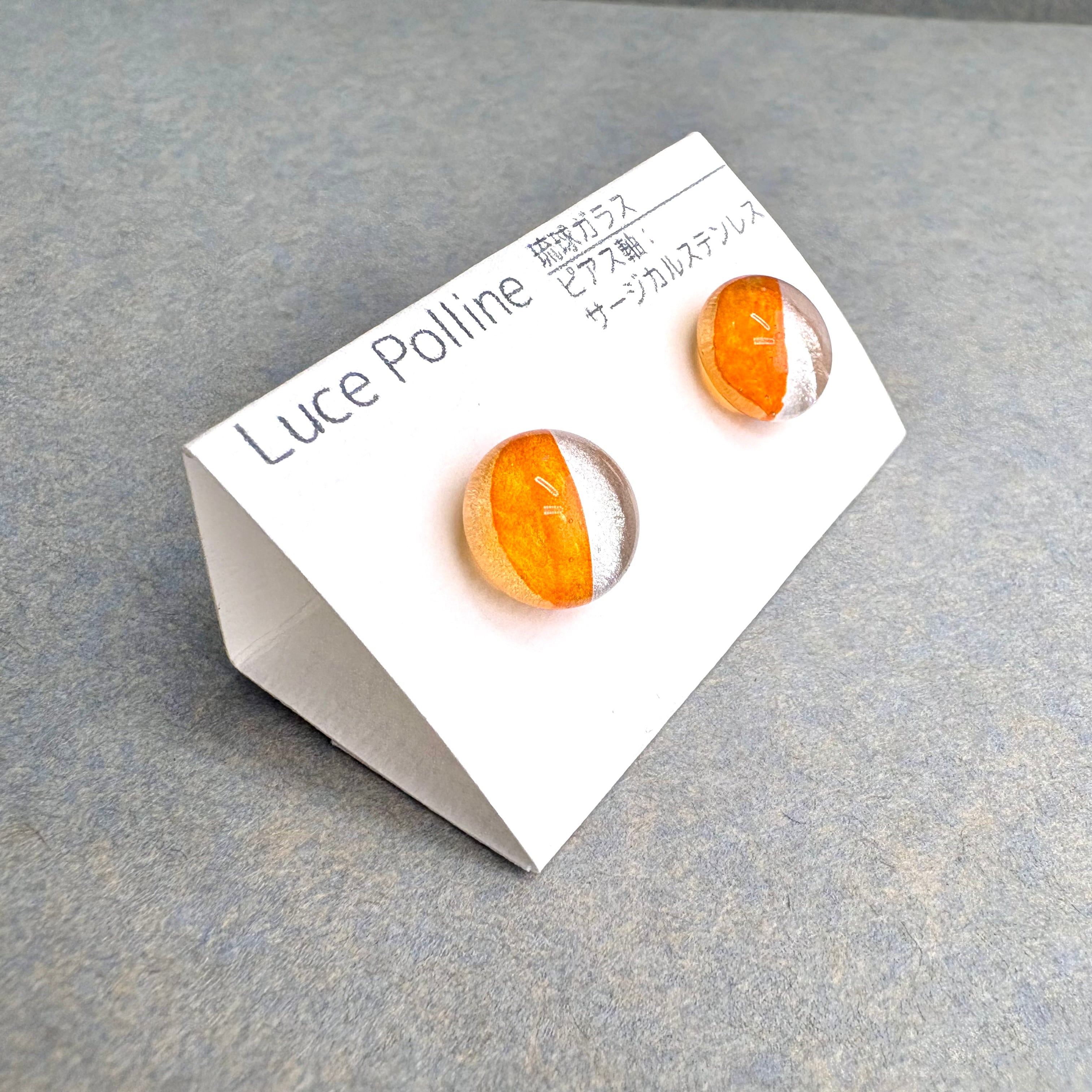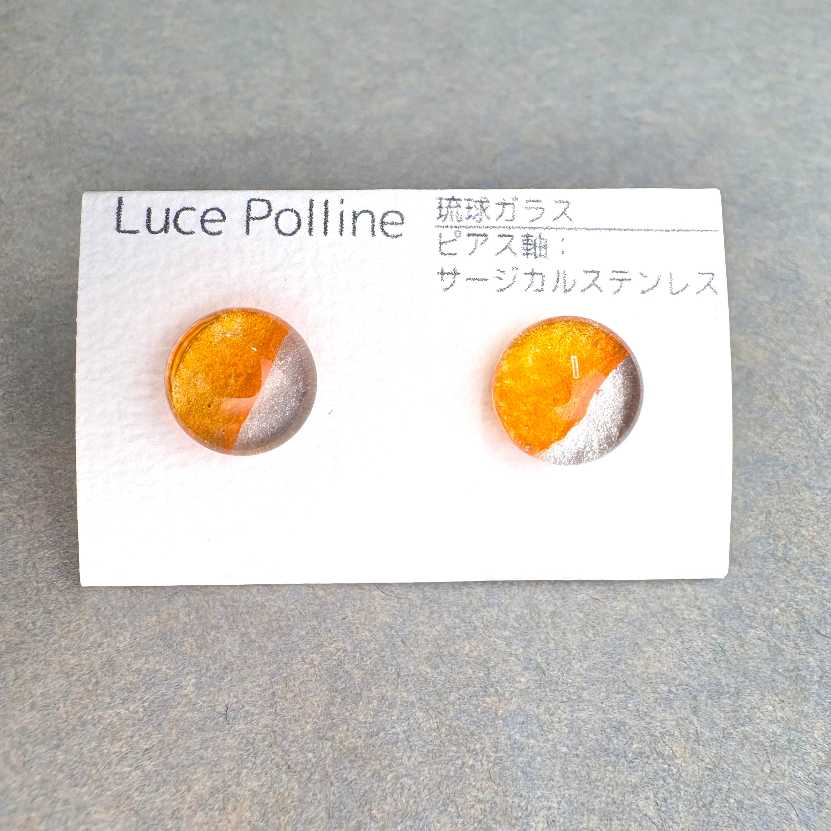透明なガラスの奥にオレンジ色が大胆な琉球ガラスの粒です。