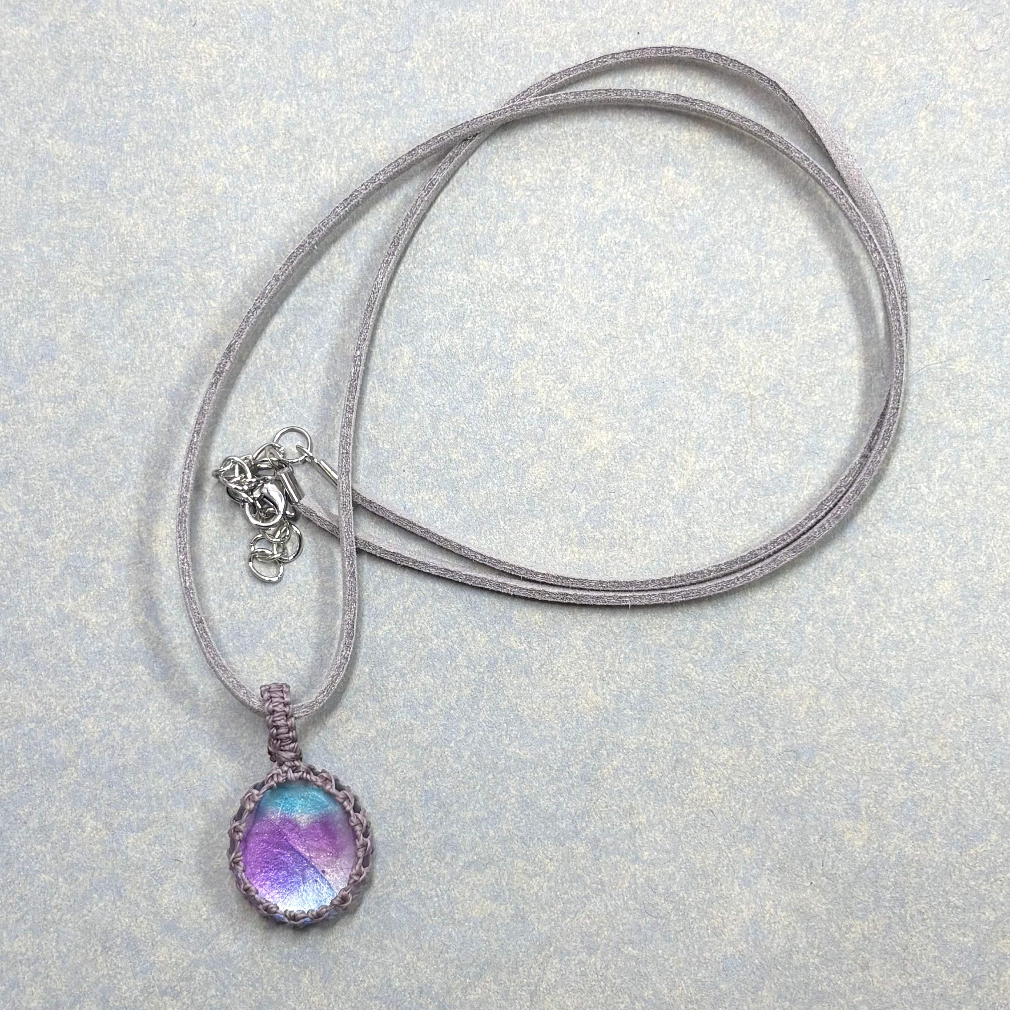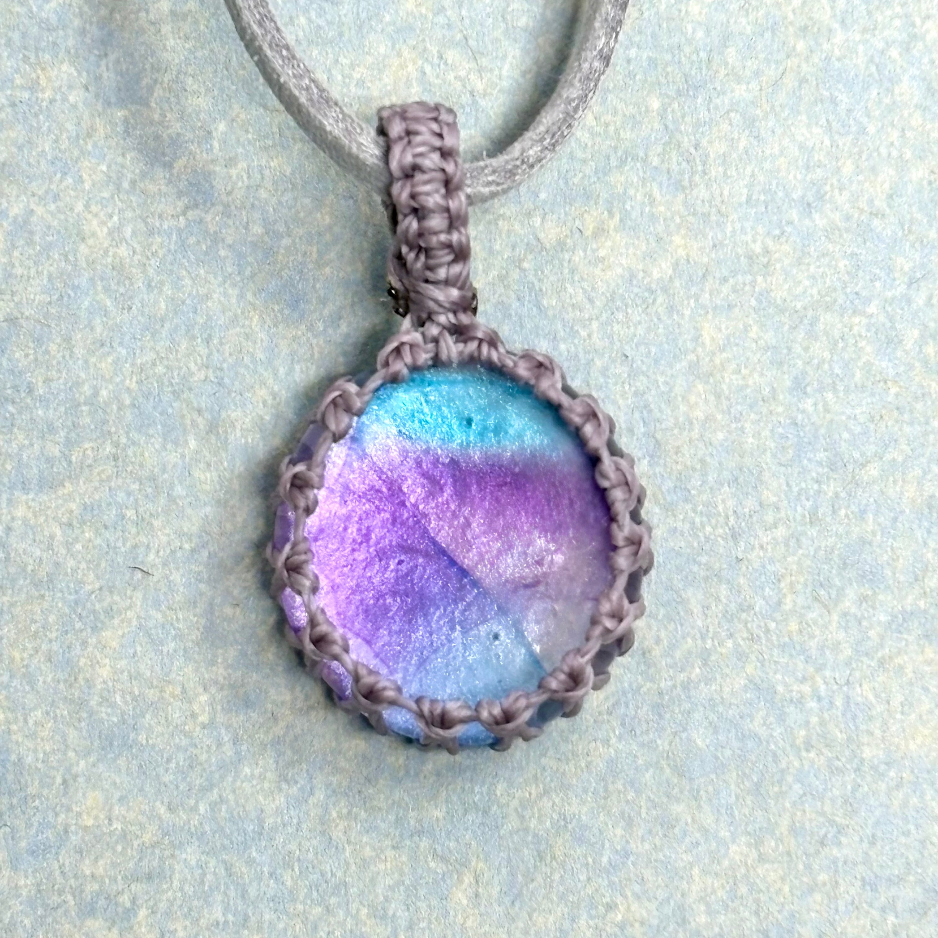 琉球ガラスの個性的な粒をマクラメ編みで包んでペンダントにしました。