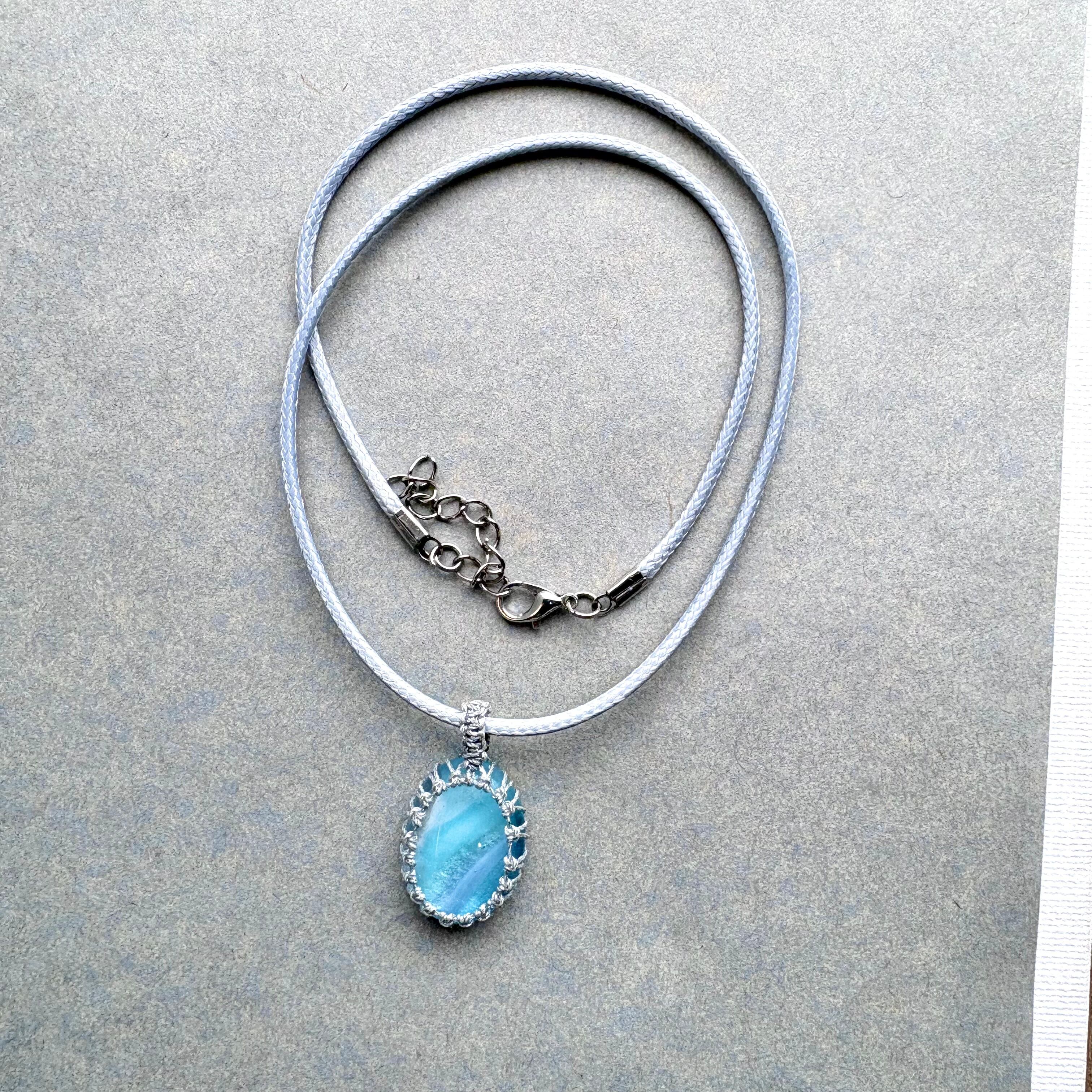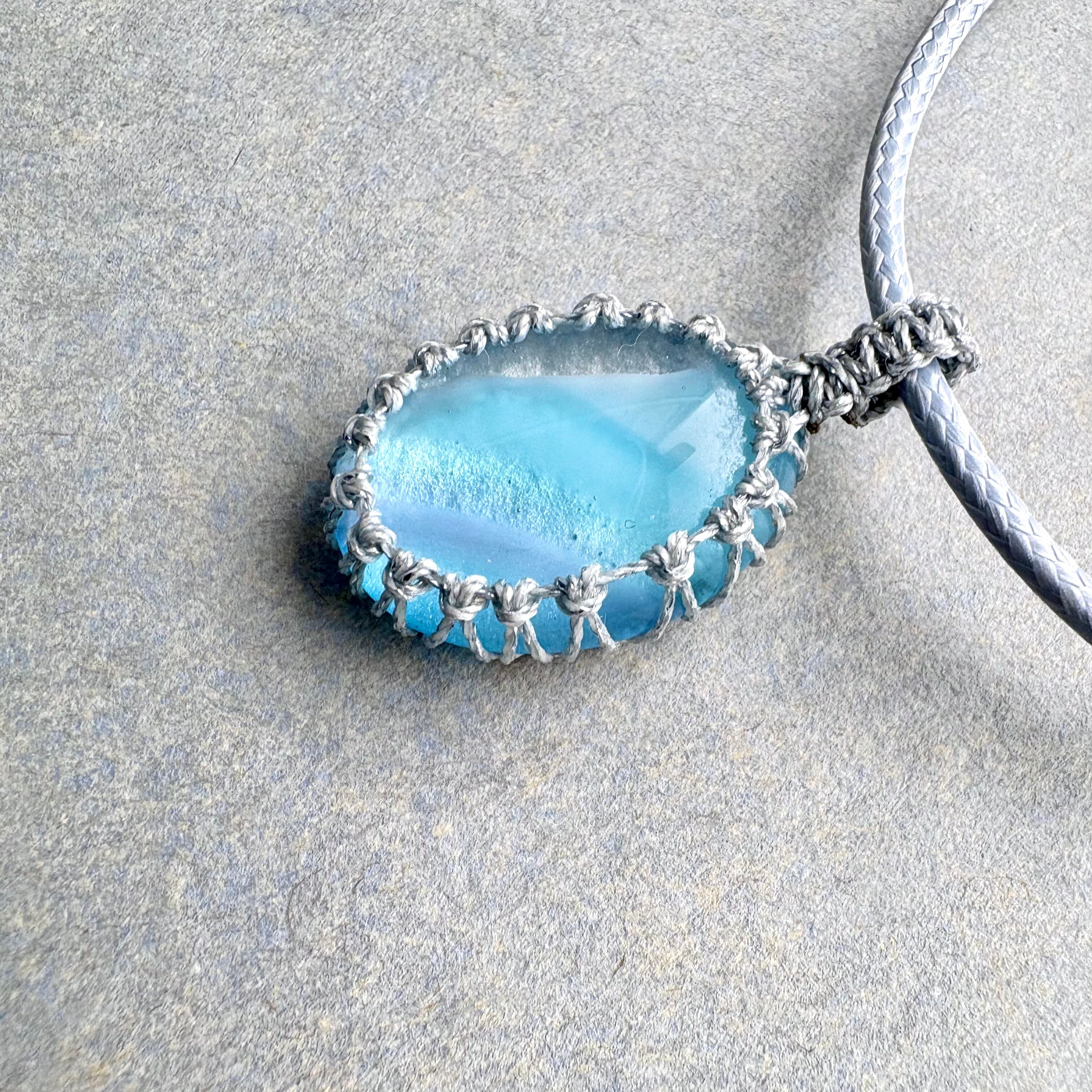琉球ガラスの個性的な粒をマクラメ編みで包んでペンダントにしました。