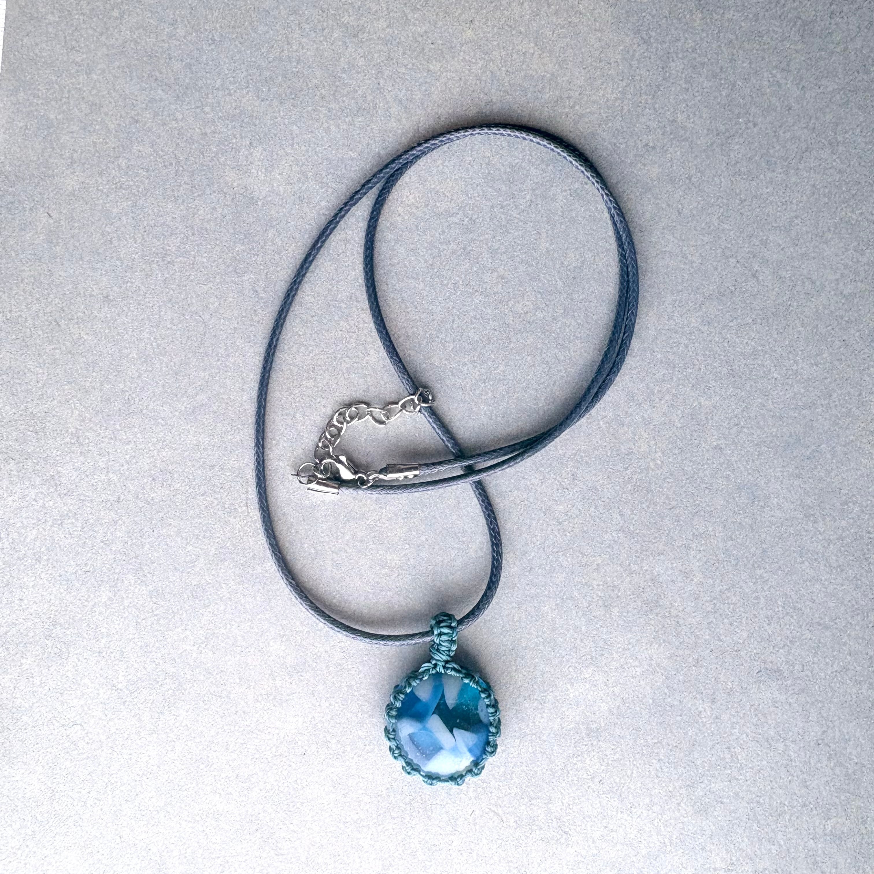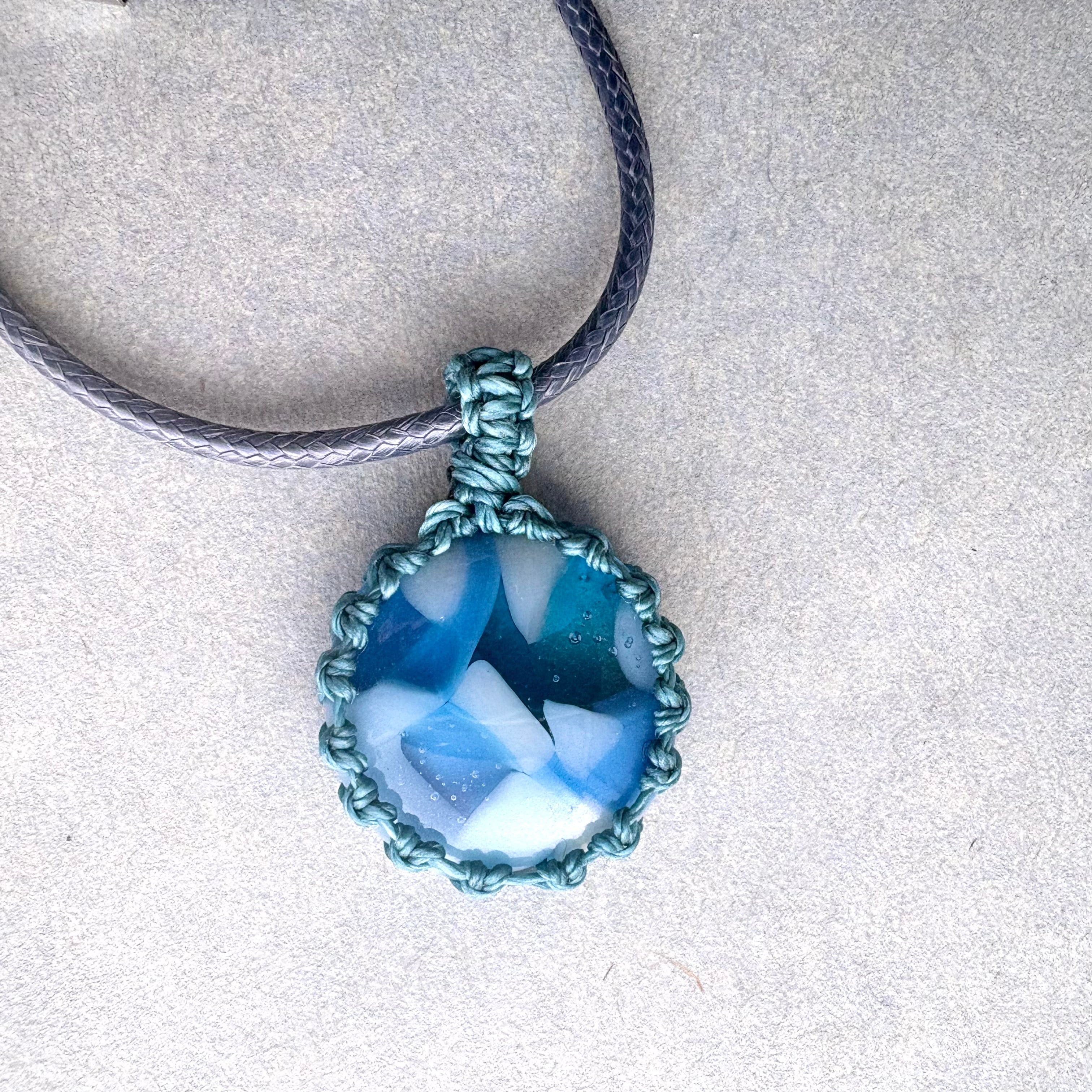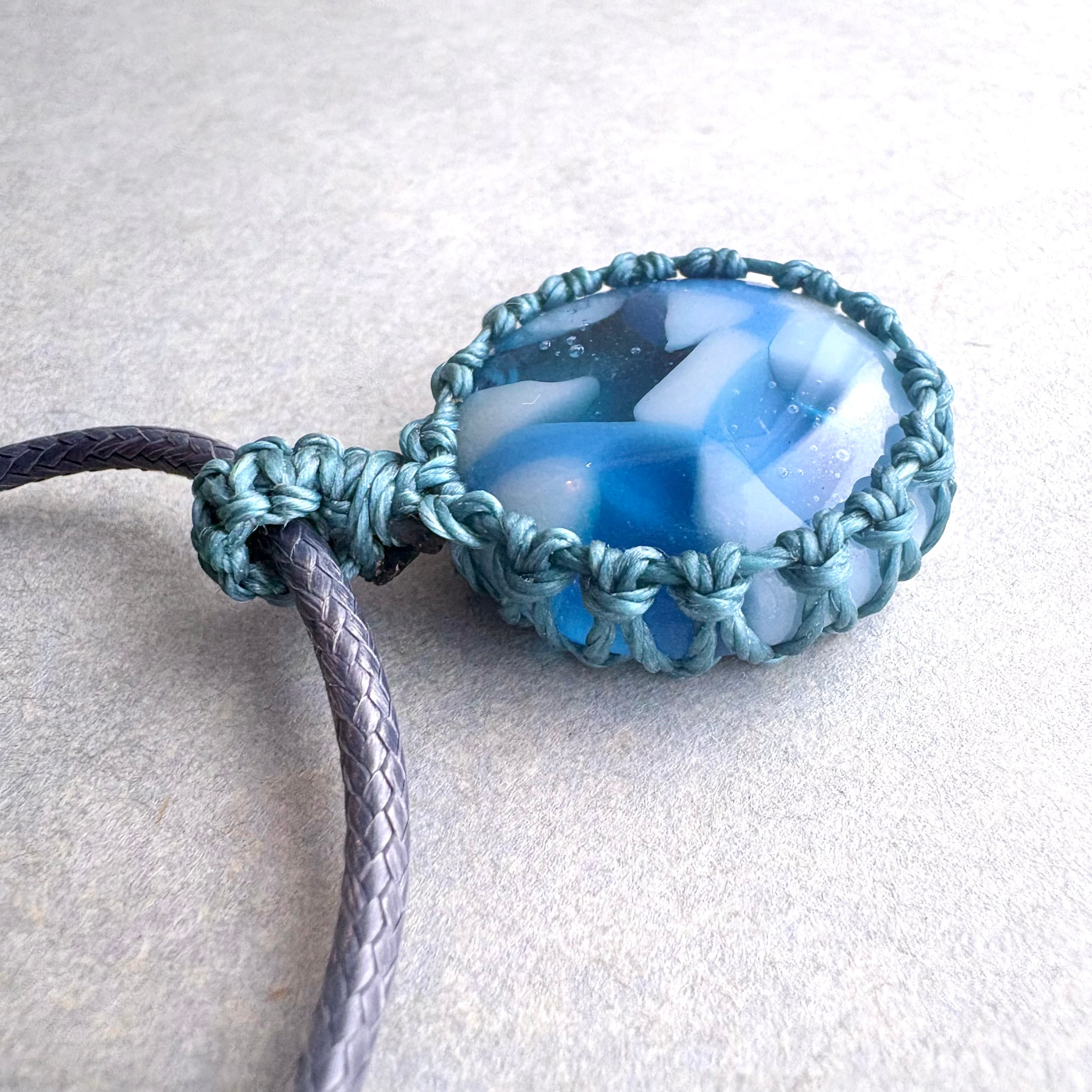 輸入ガラスをモザイク状に組み合わせてマクラメ編みで包み、個性的なペンダントにしました。