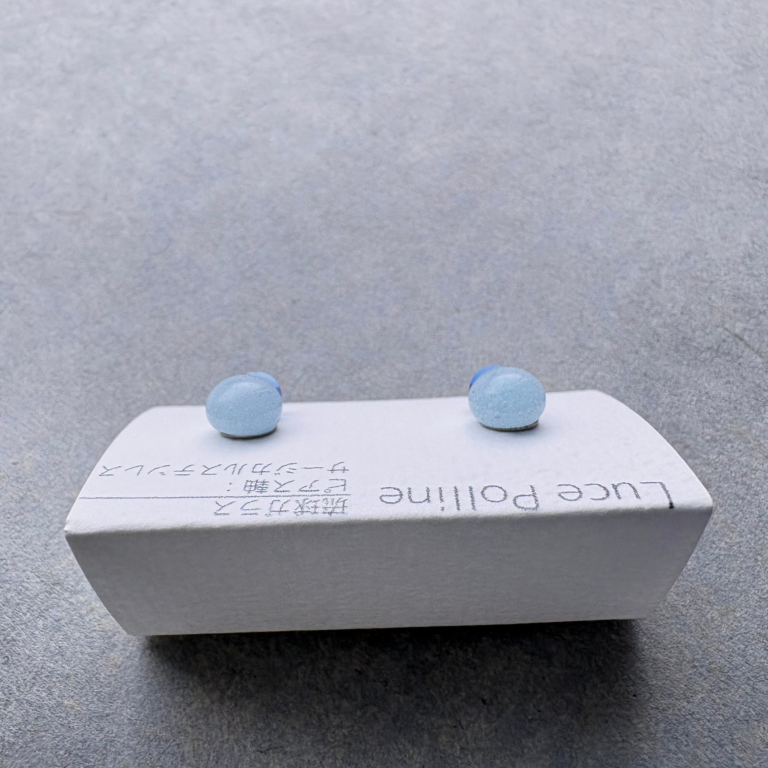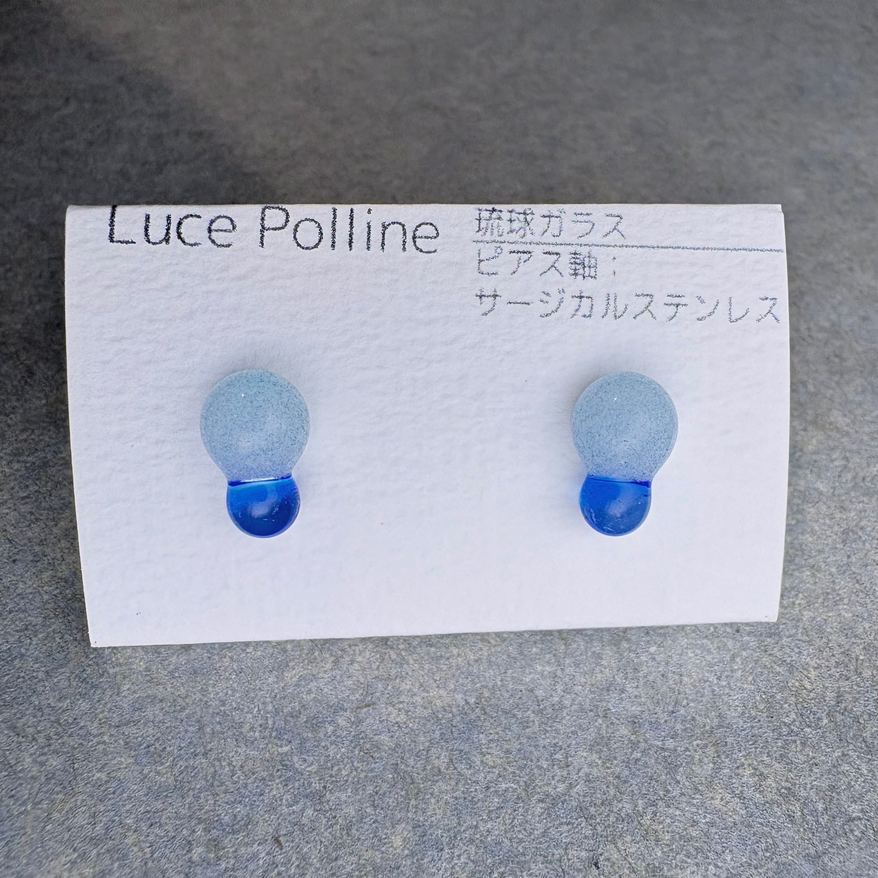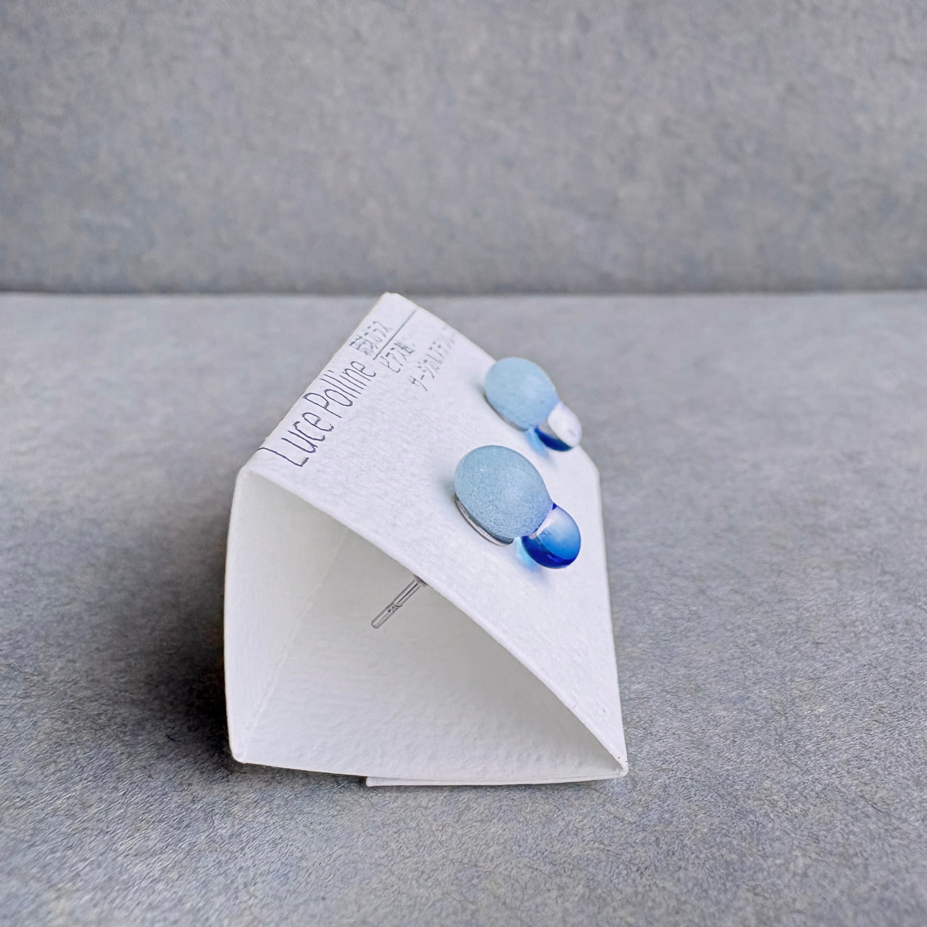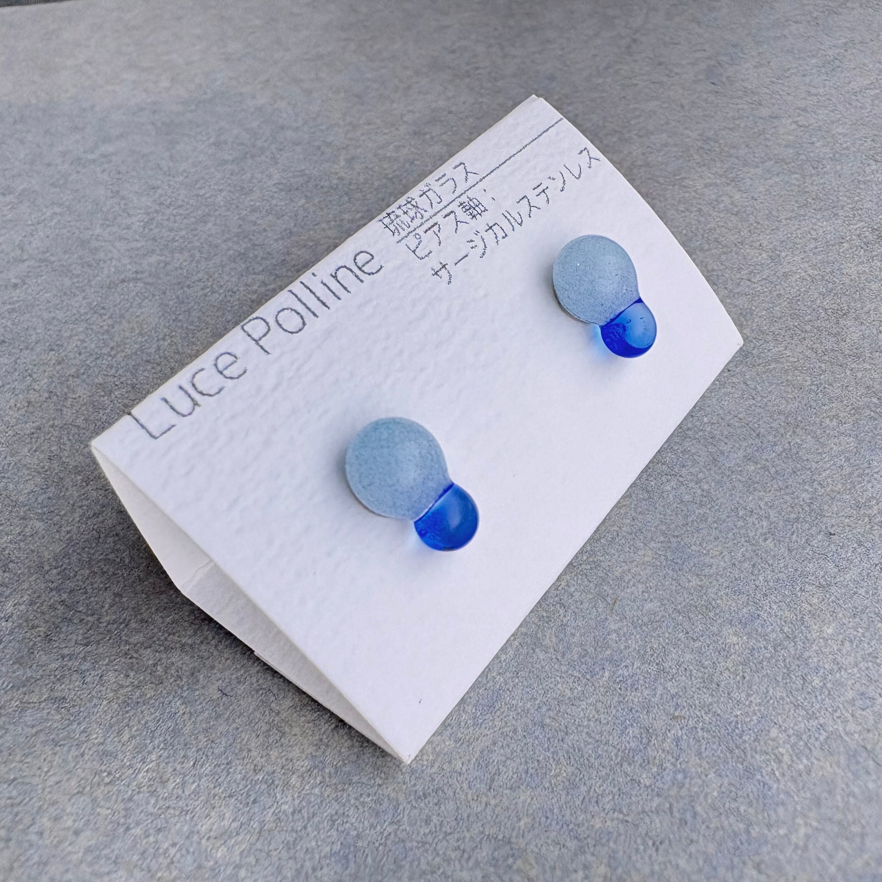 気泡たっぷりのパステルブルーのガラスに、小さな透明の青い琉球ガラスを組み合わせました。