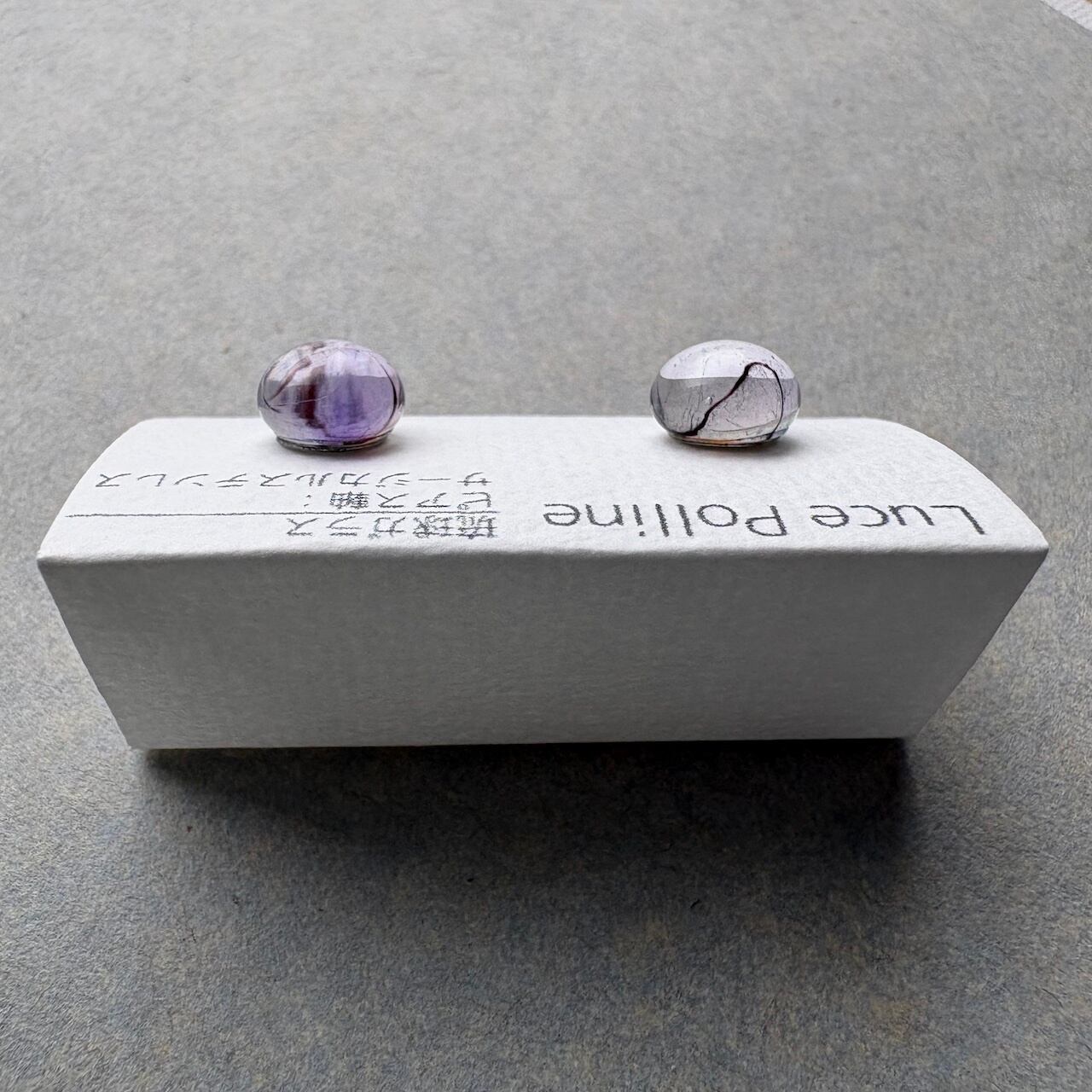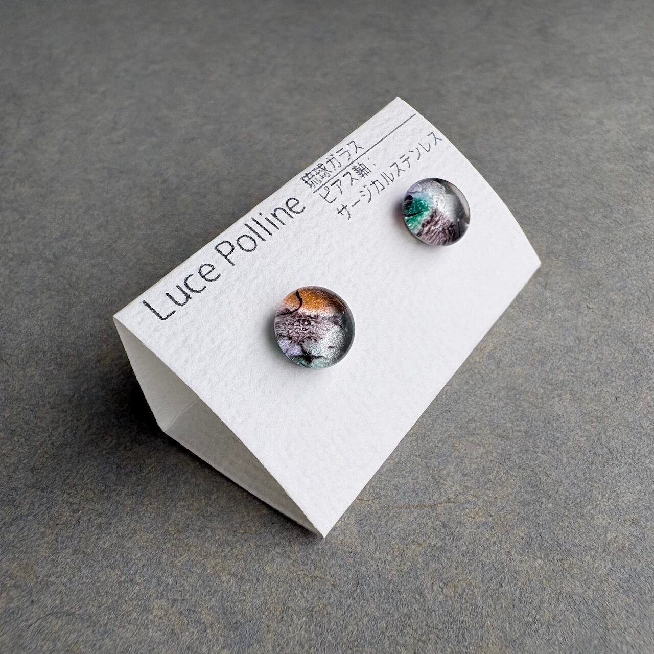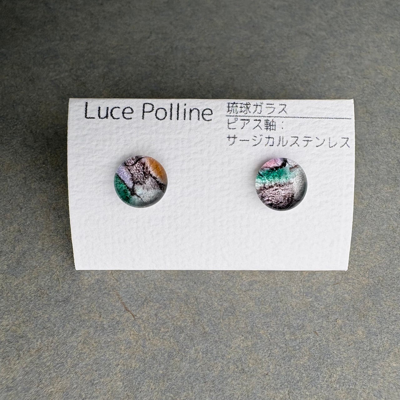 複雑な色合いの個性的な琉球ガラスの粒をピアスに仕立てました。