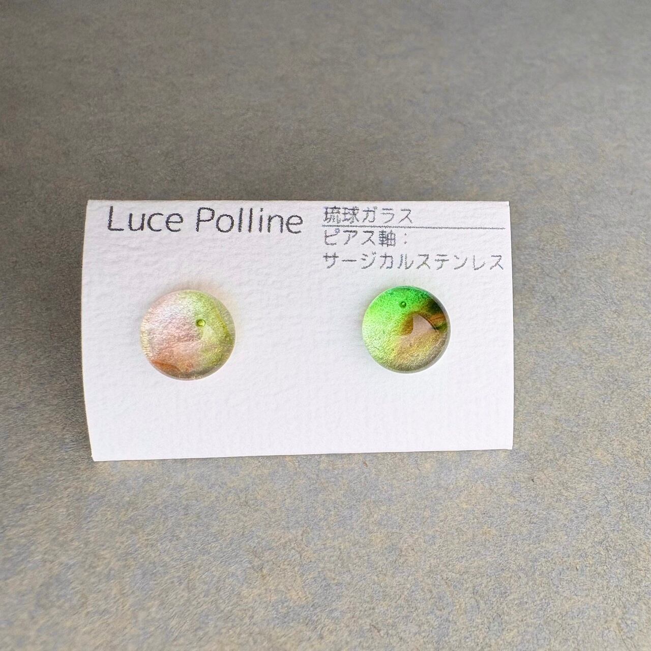 細かい霧雨の後に光る葉のような琉球ガラスの粒をピアスに仕立てました。
