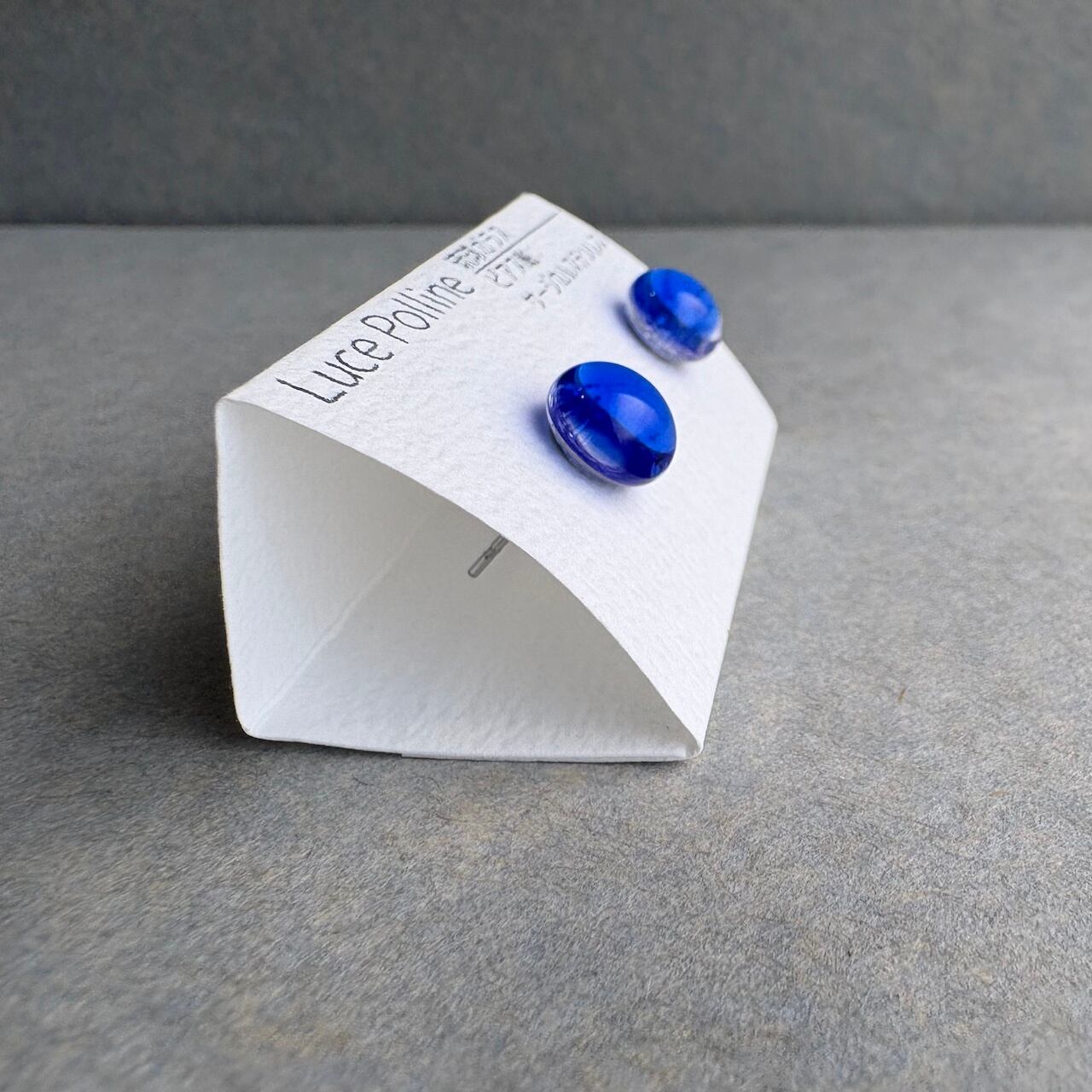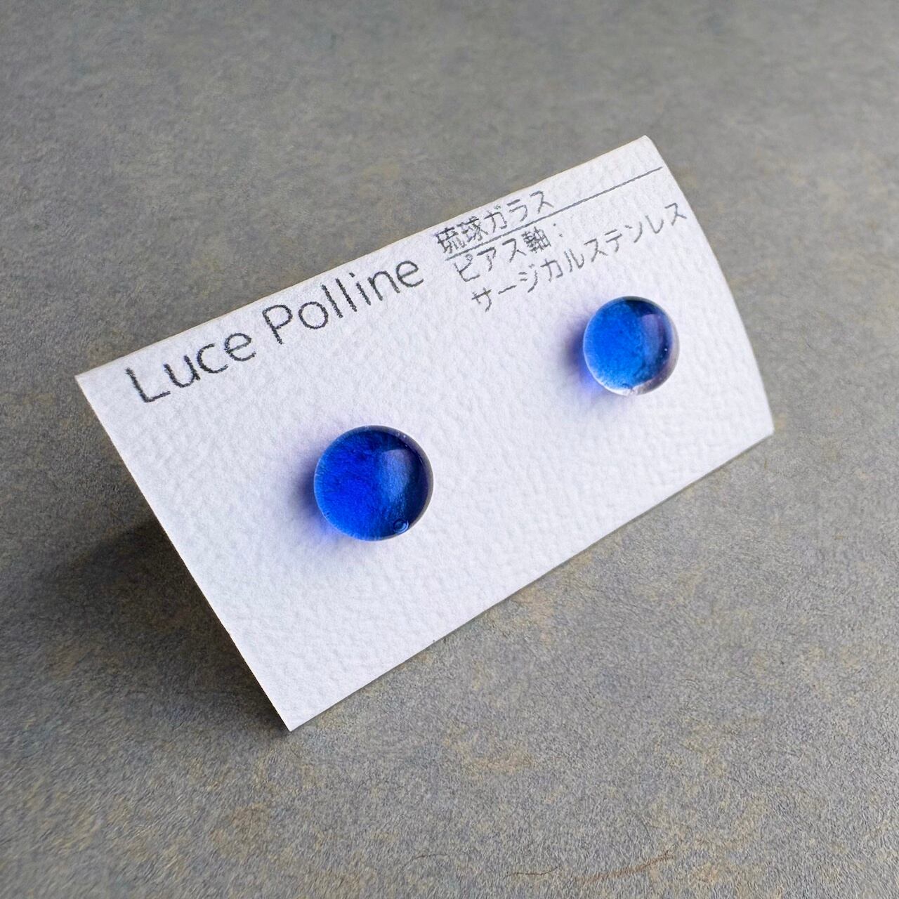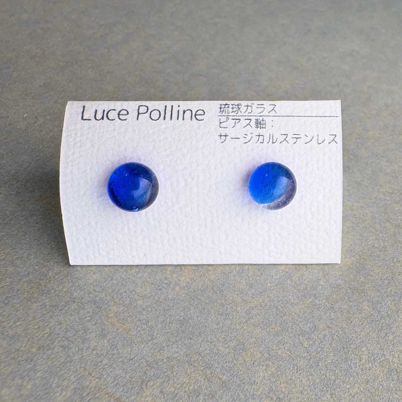 透明なガラスに青が重なる琉球ガラスの粒をピアスに仕立てました。