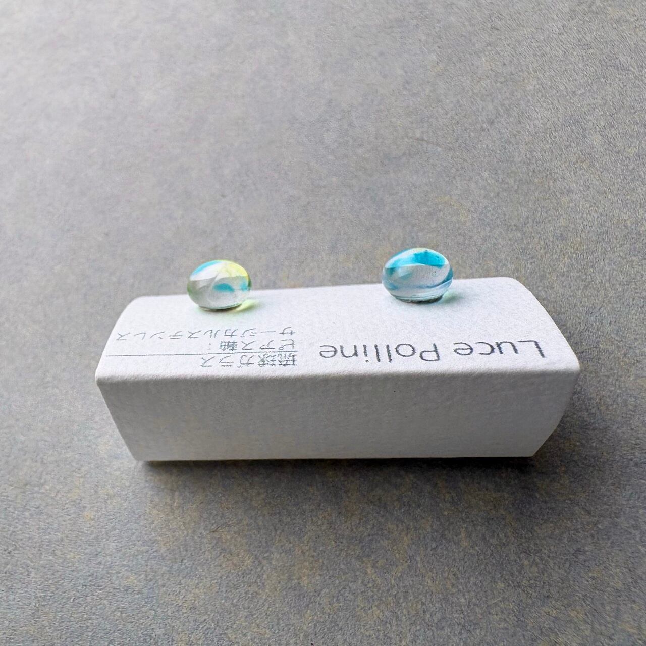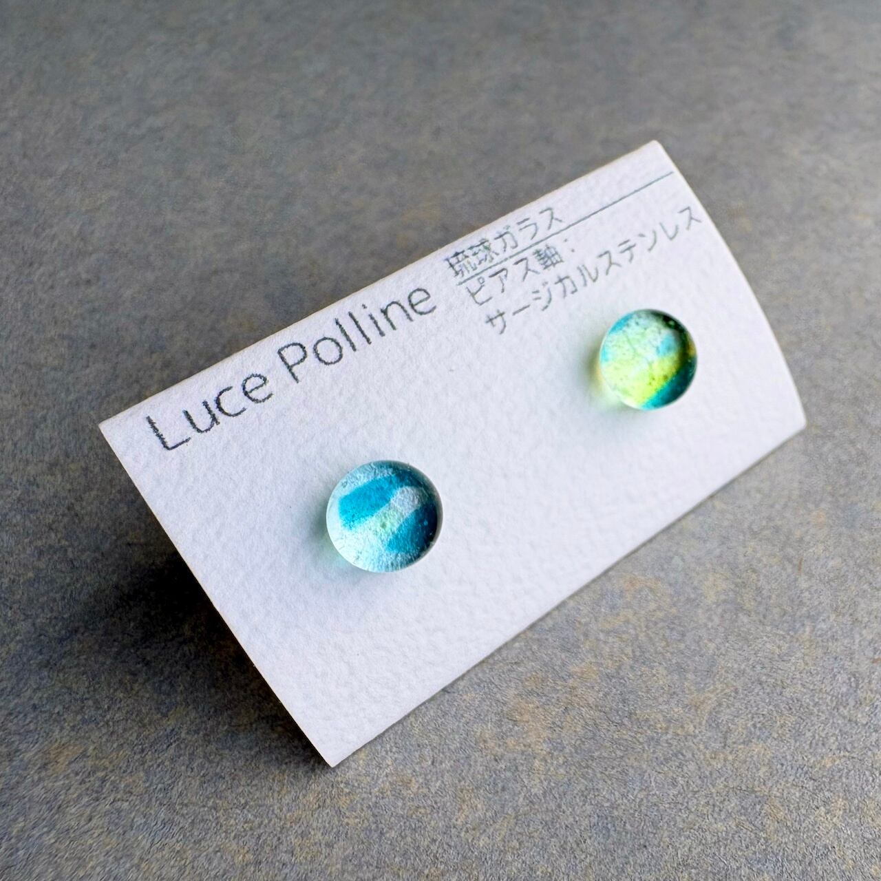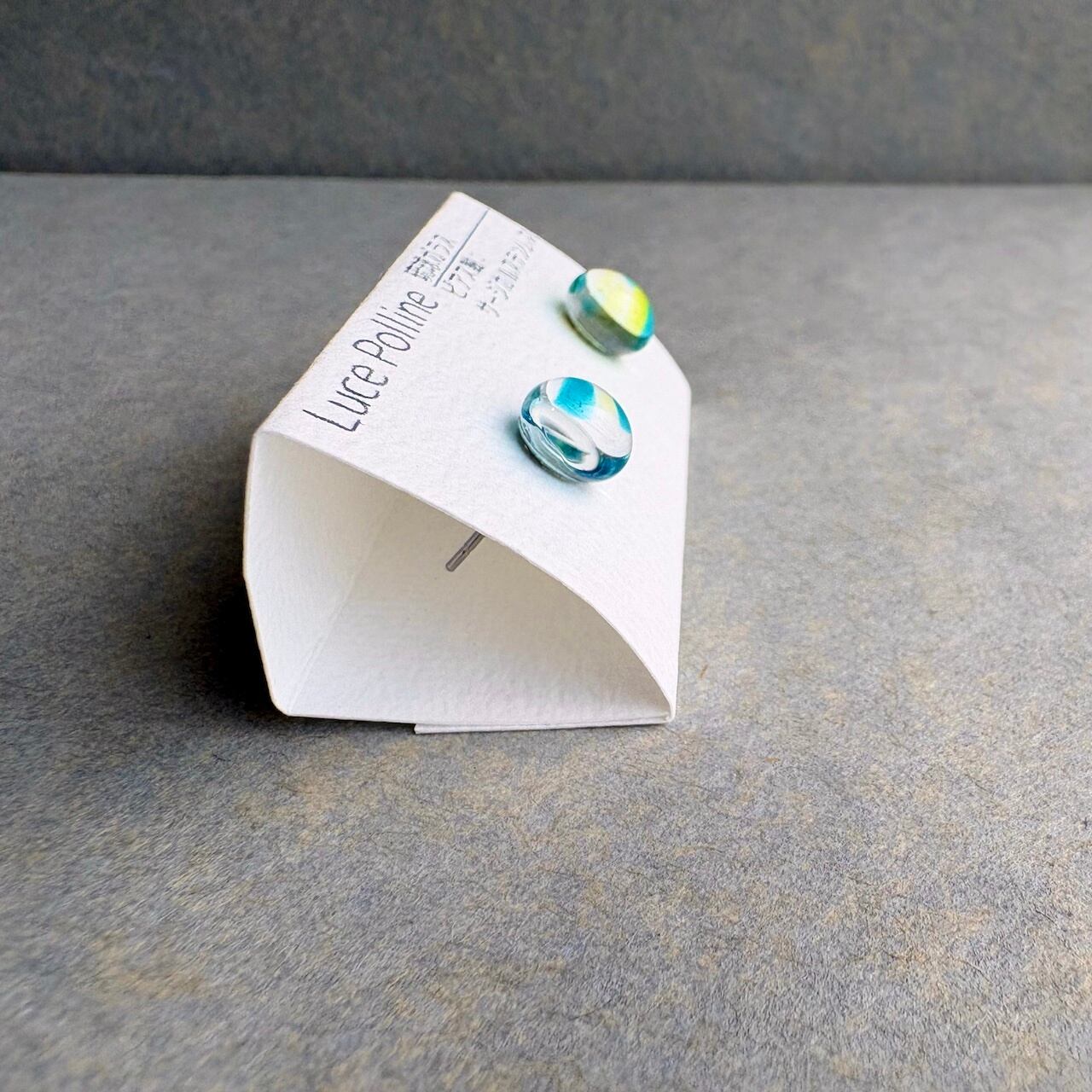 青と緑が踊るような琉球ガラスの粒をピアスに仕立てました。