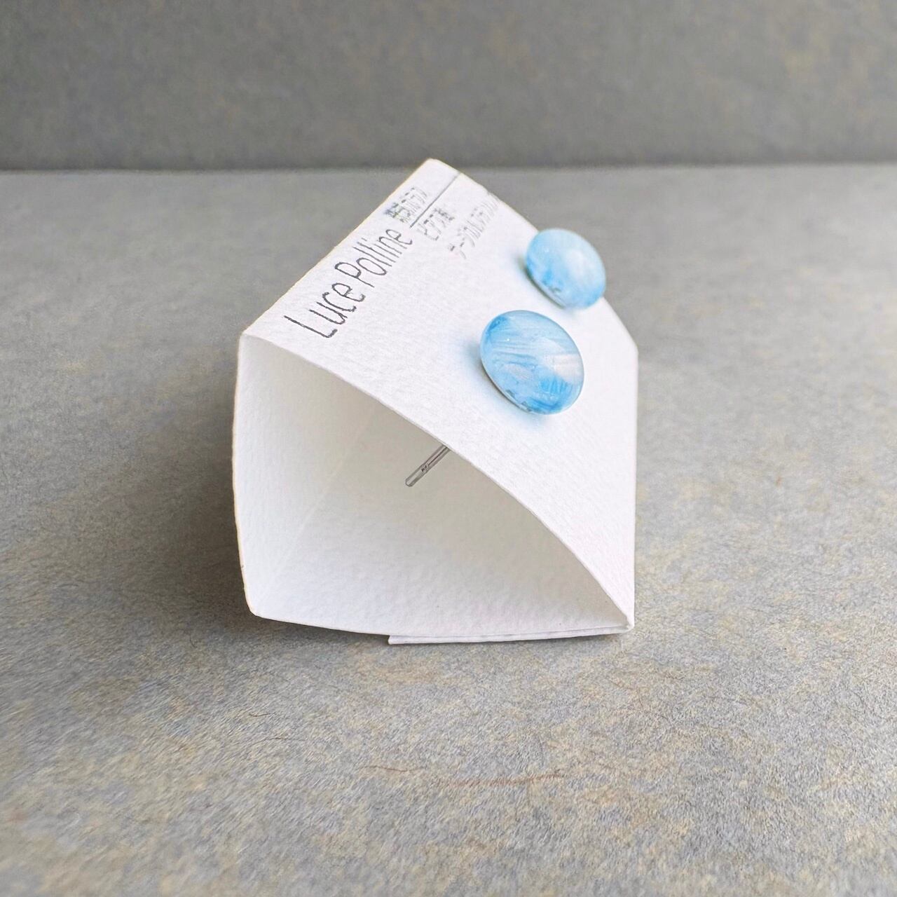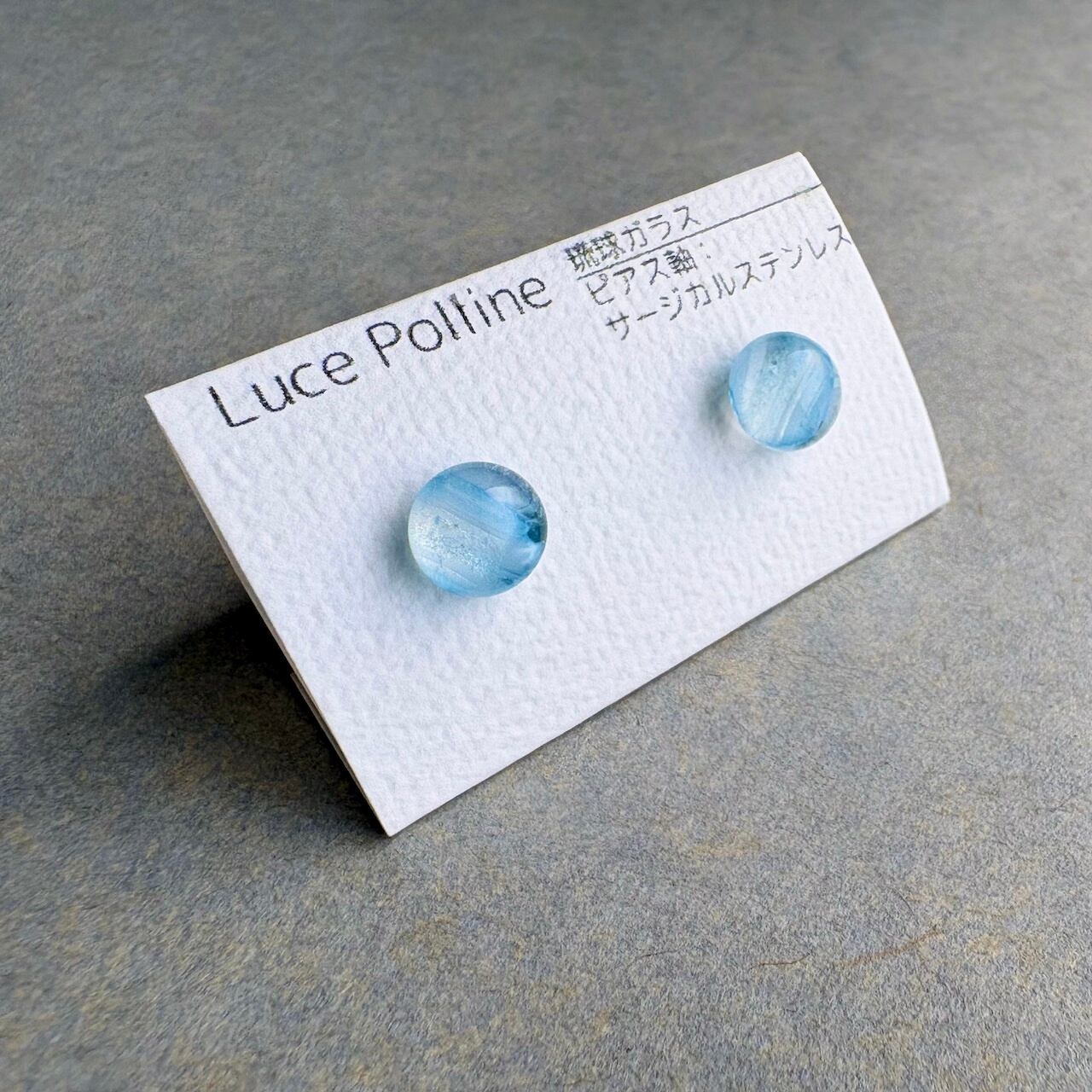 透明なガラスに白と水色のラインが美しい琉球ガラスの粒をピアスに仕立てました。